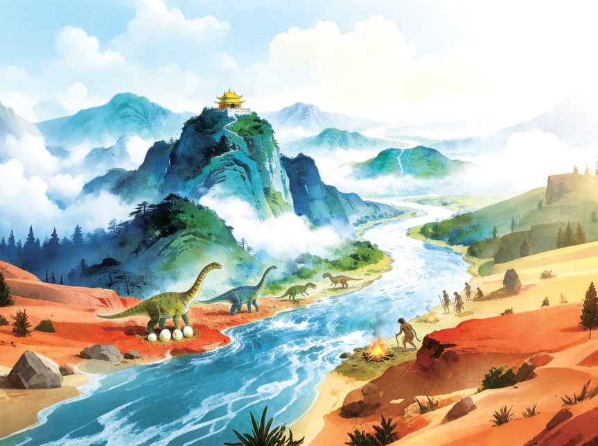尤为珍贵的是,武当主峰周边的山脉与丘陵中,保存着连续且丰富的地质记录,宛如一部立体的“地球史书”:约5亿年前寒武纪的深海黑色岩系蕴藏稀有绿松石矿,是武当文化中珍贵的文化符号;约3亿年前石炭纪的滨海沼泽碎屑岩富含古植物化石,还原远古生态图景;约8600万年前白垩纪的内陆盆地红层埋藏巨量恐龙蛋化石,见证史前生命繁荣;百万年前古汉江阶地沉积物中,“郧县人”头骨化石的发现,填补了古人类演化的重要空白。