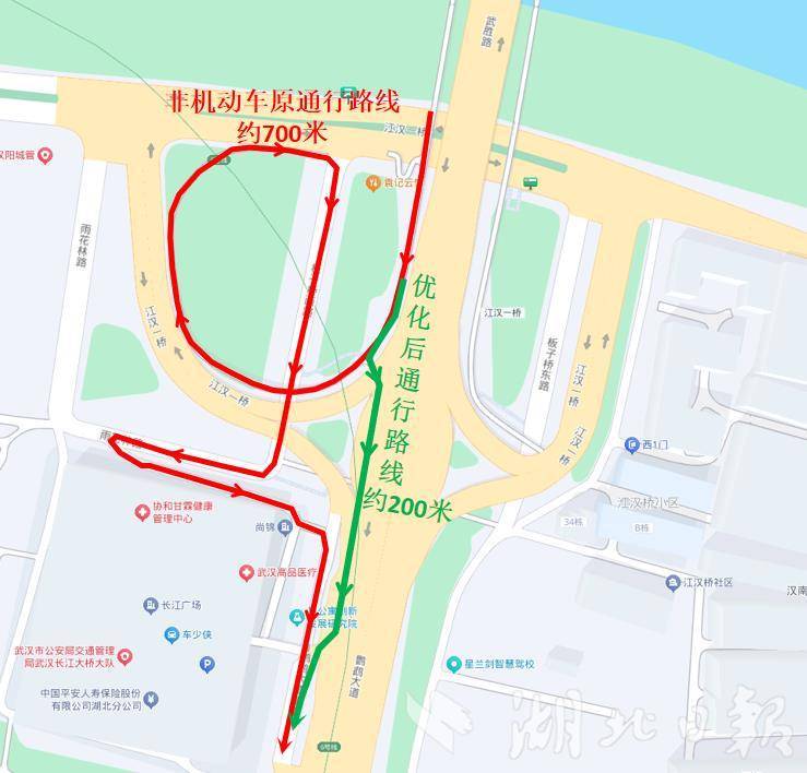 随着长江大桥非机动车道开通,江汉桥的非机动车流量也在增加,在日常巡查与市民反馈中,汉阳交警注意到另一个关联痛点:从江汉桥(汉口往汉阳方向)下来的非机动车,长期以来必须绕行至桥下,再费力折返爬上鹦鹉大道。“每次多绕一大圈,觉得好麻烦。”一位经常通勤的市民李先生反映道。