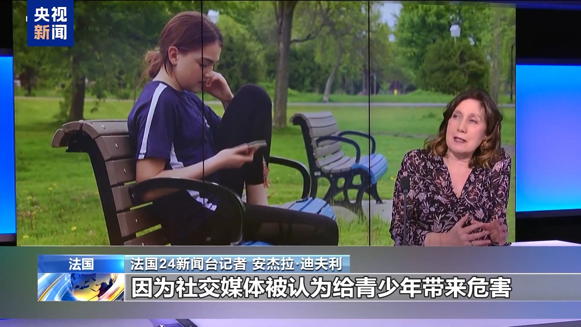 法国24新闻台记者 安杰拉·迪夫利:推进禁令的原因,大家都知道。因为社交媒体被认为给青少年带来危害,容易让人沉迷其中、浪费时间,危害他们的心理健康。