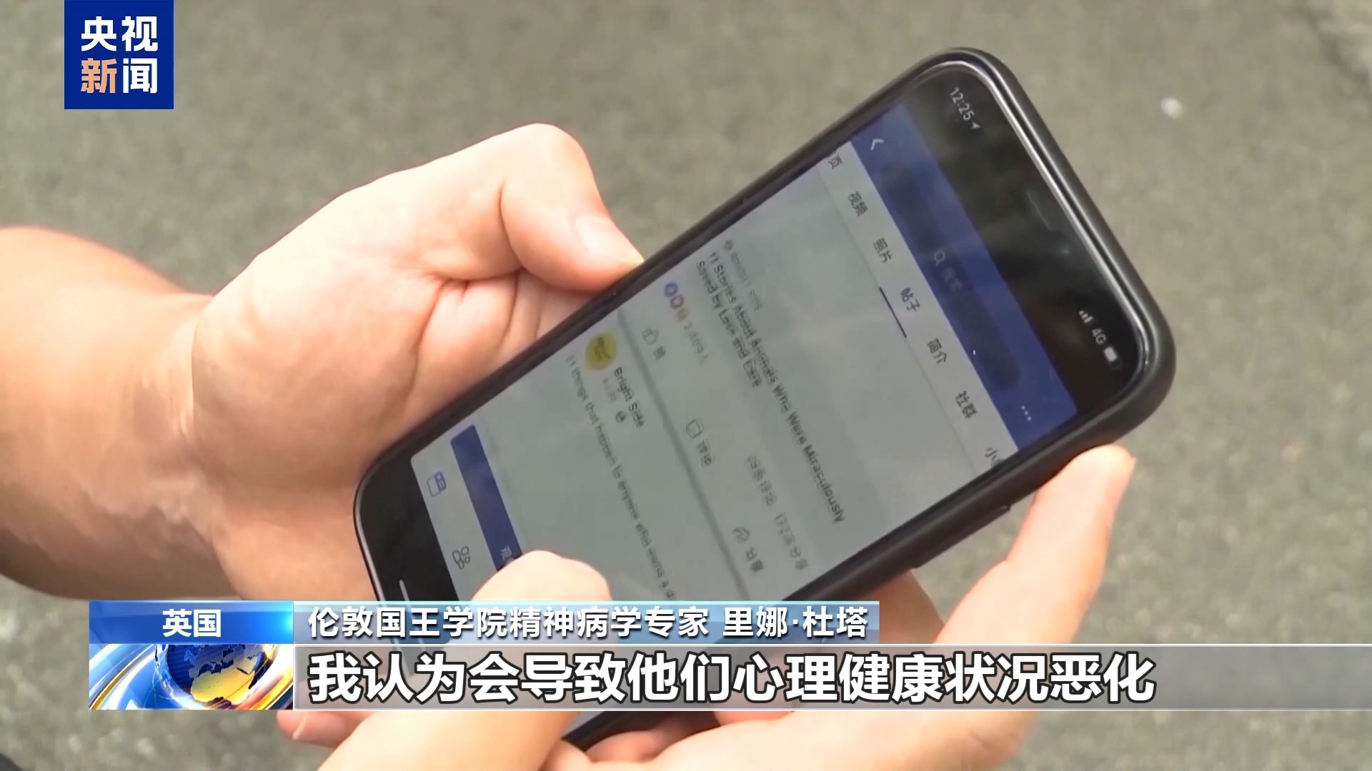 英国伦敦国王学院精神病学专家 里娜·杜塔:对于一些孩子来说,一旦被不良算法裹挟,算法就会不断推送各类内容。他们可能会接触到这个年纪本不该看到的信息,这会引发诸多问题,我认为会导致他们心理健康状况恶化。尤其是如果家长、监护人或老师未能及时发现这一情况,孩子只能独自承受,甚至连向朋友倾诉都做不到的话,后果会更加严重。这种独自承受的状态,再加上可能遭遇的网络欺凌,带来的危害会极大。我在临床工作中就见过这样的案例。