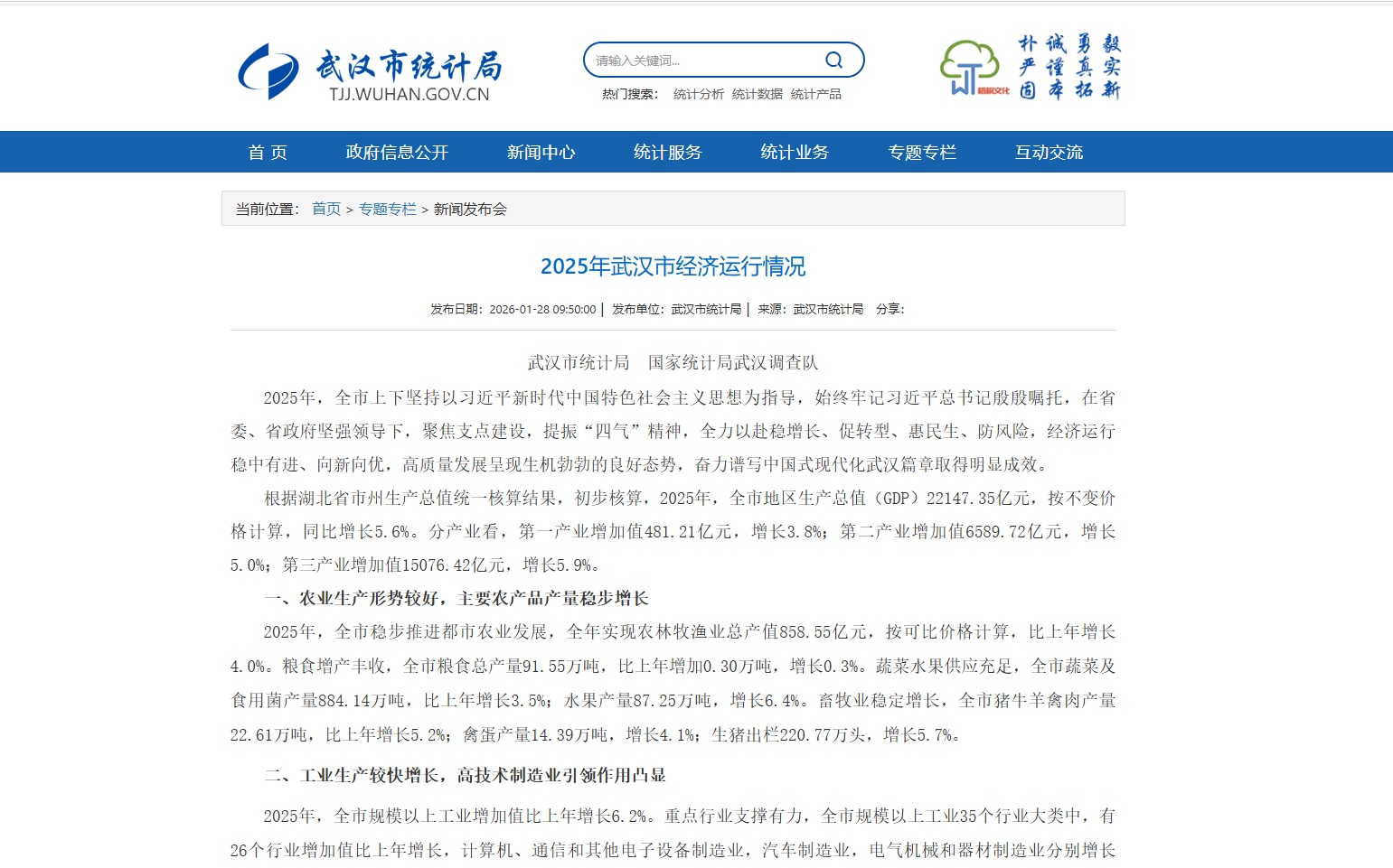 1月28日,武汉市统计局、国家统计局武汉调查队公布2025武汉市经济运行情况。根据统一核算结果,2025年,武汉市GDP22147.35亿元,同比增长5.6%。以下为全文——