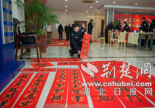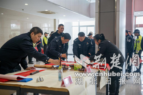 活动现场墨香氤氲、热闹非凡。湖北省警察协会邀请的15位书画家们展纸提笔,挥毫泼墨,一幅幅刚劲有力、寓意吉祥的春联跃然红纸之上,既有“福满家园”的温馨期许,也有“新春吉庆”的美好祈愿。