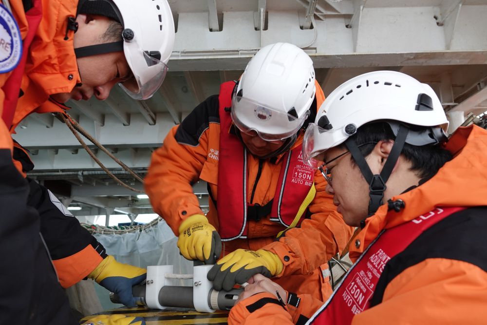船时2026年1月26日凌晨,“雪龙”号大洋队队员曾定勇(中)与队友韩哲一(右)、宋德海正在连接潜标上的观测仪器。
