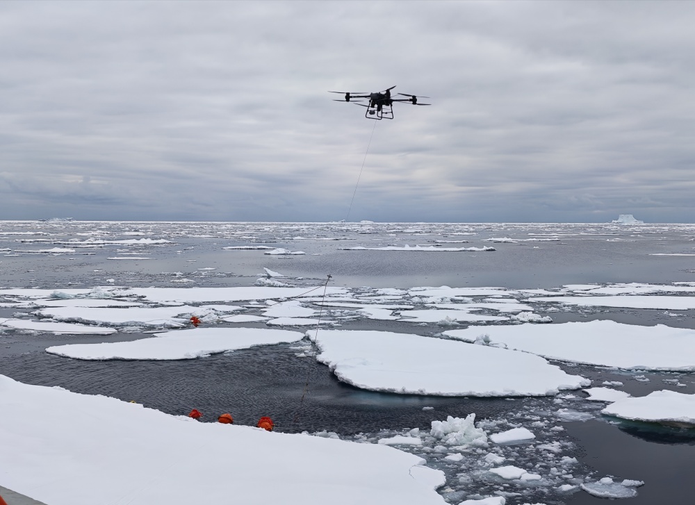 船时2026年1月25日4时许,“雪龙”号无人机抛下的锚钩成功捕获“锚碇式潜标观测系统”(俗称潜标)缆绳。