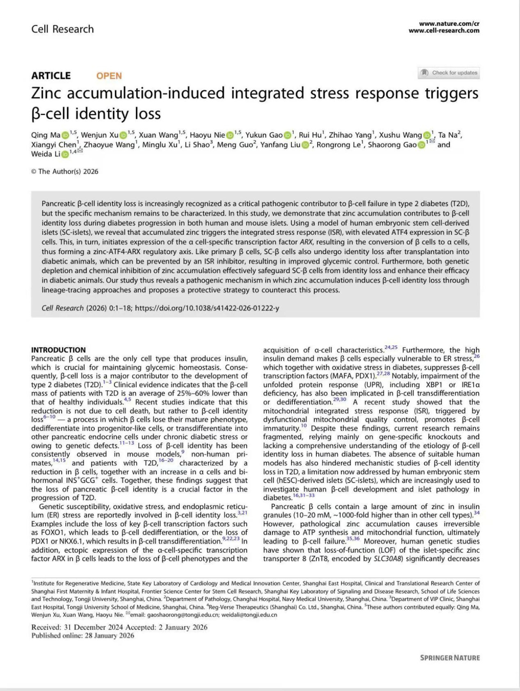 据李维达介绍,国内多家顶级医疗机构的临床专家已与他们接洽合作,共同推进后续的临床转化研究。“从为晚期糖尿病患者提供耐逆型胰岛类器官的‘细胞强化移植’方案,到为糖尿病前期人群研发 ZnT8 抑制剂类预防药物,我们期待与各界携手,共同将这份源于中国科学家的智慧转化为惠及全球患者的健康成果。”他表示。