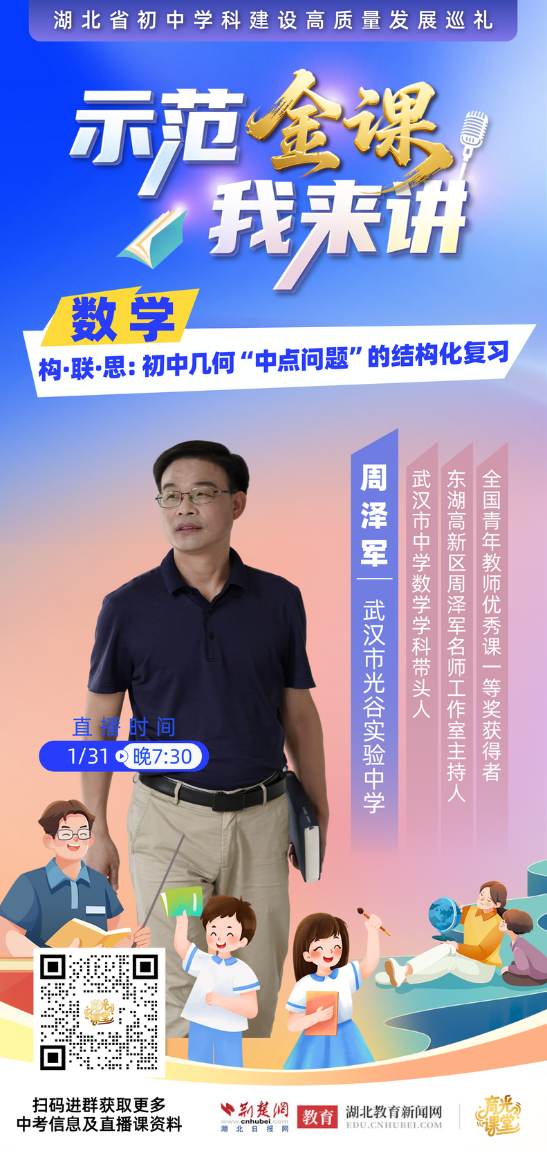 荆楚网(湖北日报网)讯(记者齐一璇、许文秀)几何复习遇到瓶颈?如何将零散知识点串联成网?1月31日晚7:30,武汉市光谷实验中学周泽军老师将带来一堂“构·联·思:初中几何‘中点问题’的结构化复习”示范金课,为学子梳理几何脉络,建立几何思维结构系统。