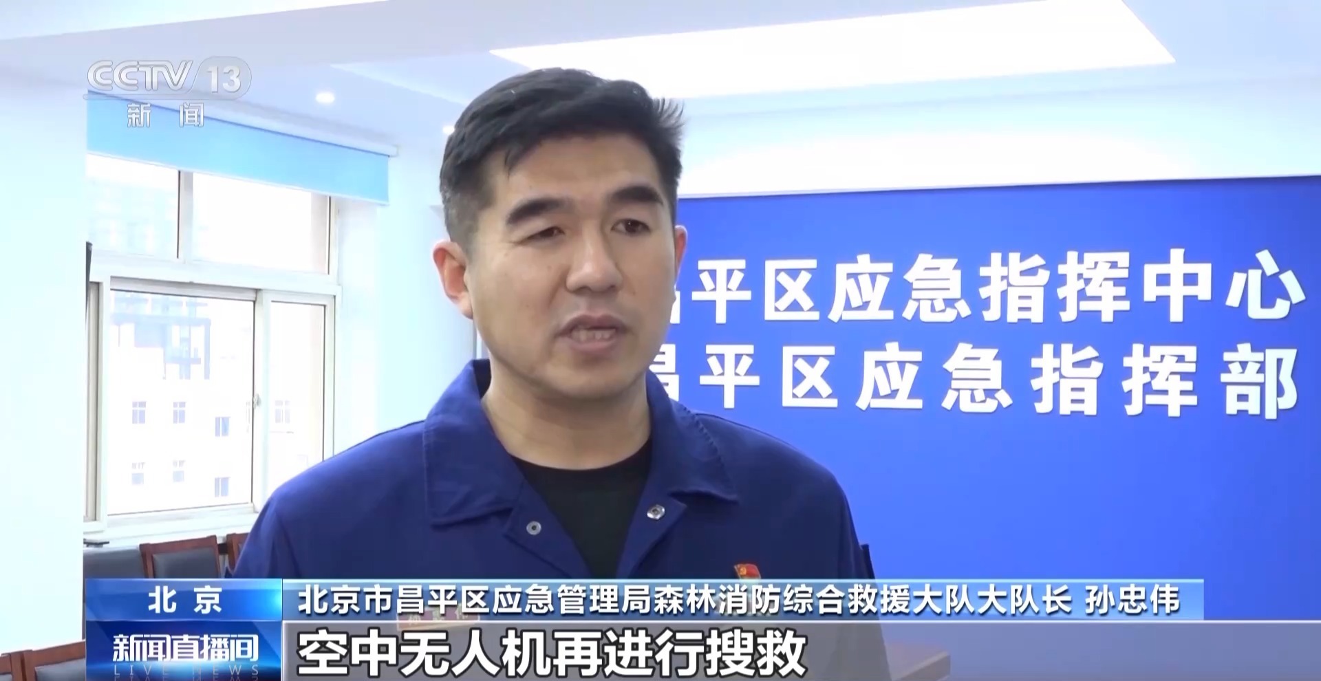 北京市昌平区应急管理局森林消防综合救援大队大队长 孙忠伟:队员们进行地毯式搜救,空中无人机再进行搜救,总共出动了400多人,用了6个多小时搜救,又用了1个多小时的时间把他们营救下来。
