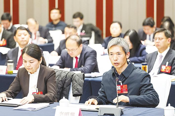 1月27日,黄冈市代表团审议省政府工作报告,省人大代表李明攀(右)发言。(湖北日报全媒记者 任勇 摄)