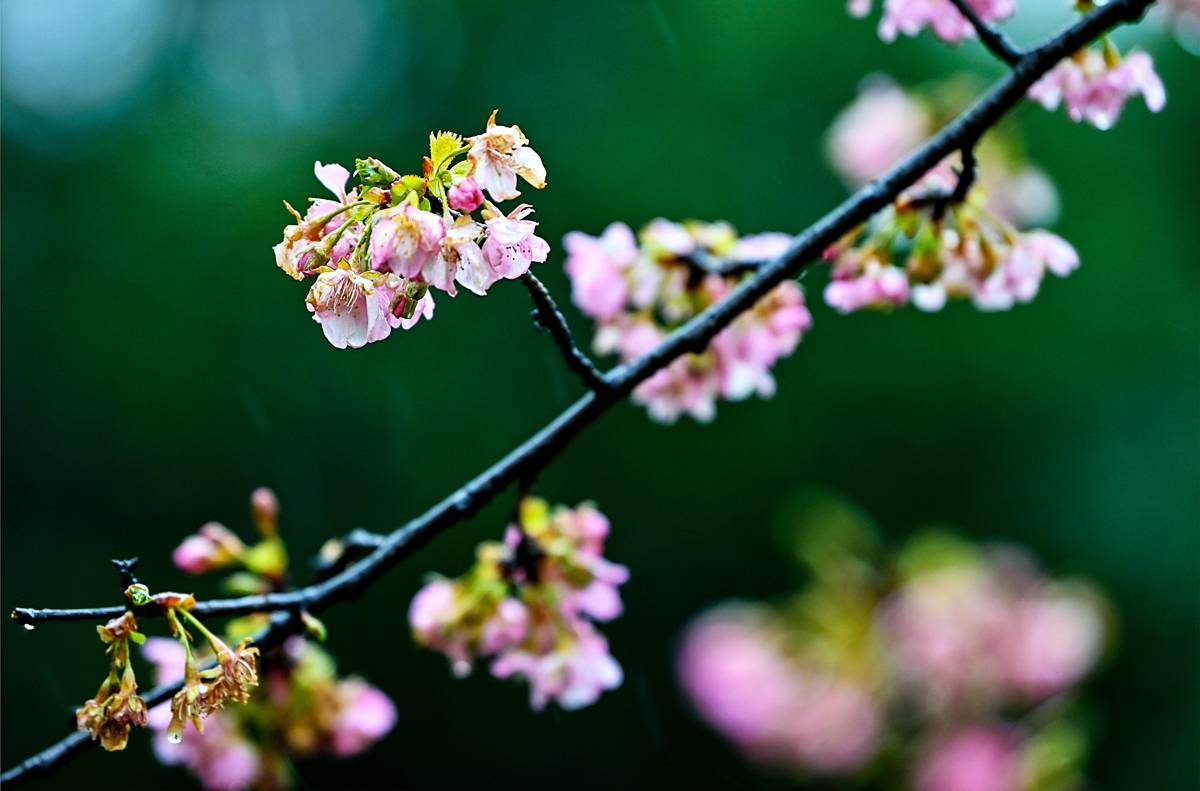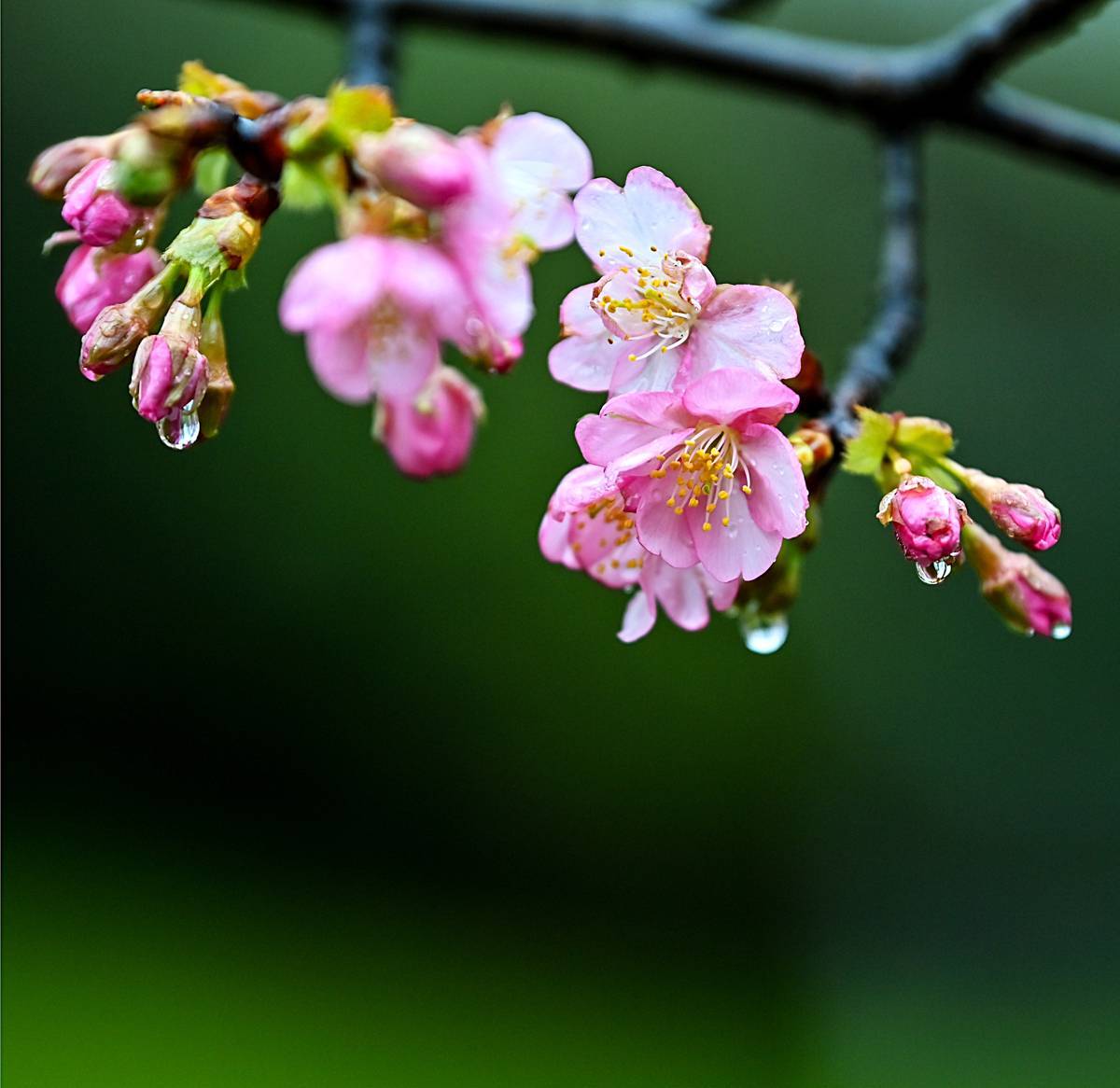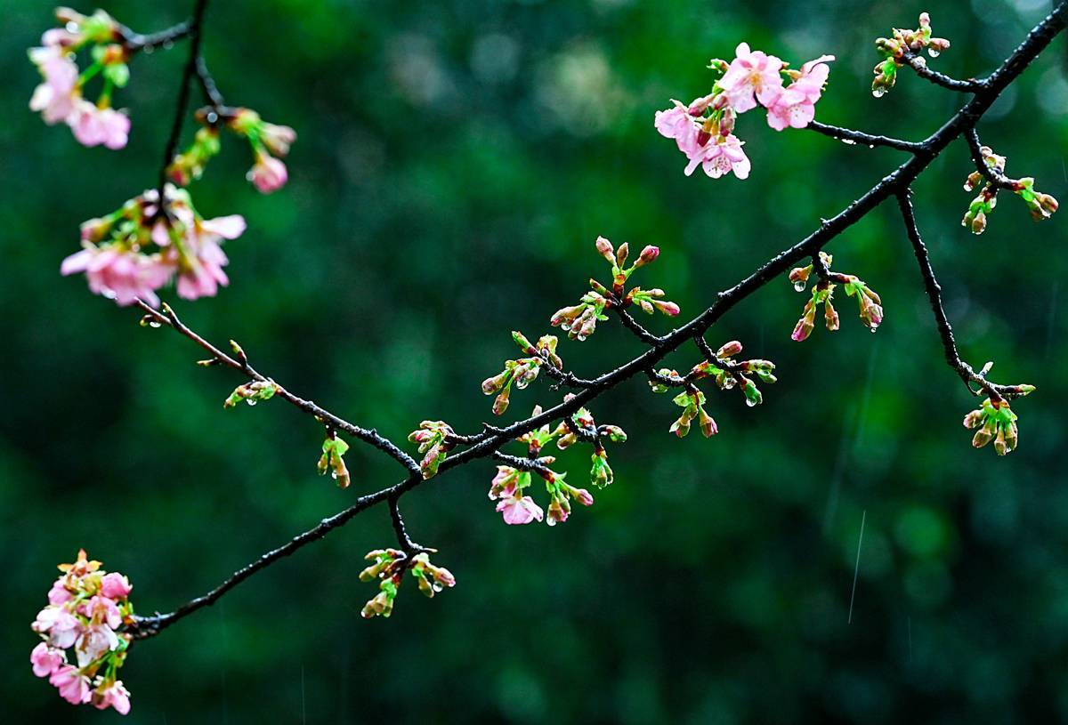 1月30日,武汉下着小雨,位于青山区的武汉市园林科普公园的早樱提前开放。