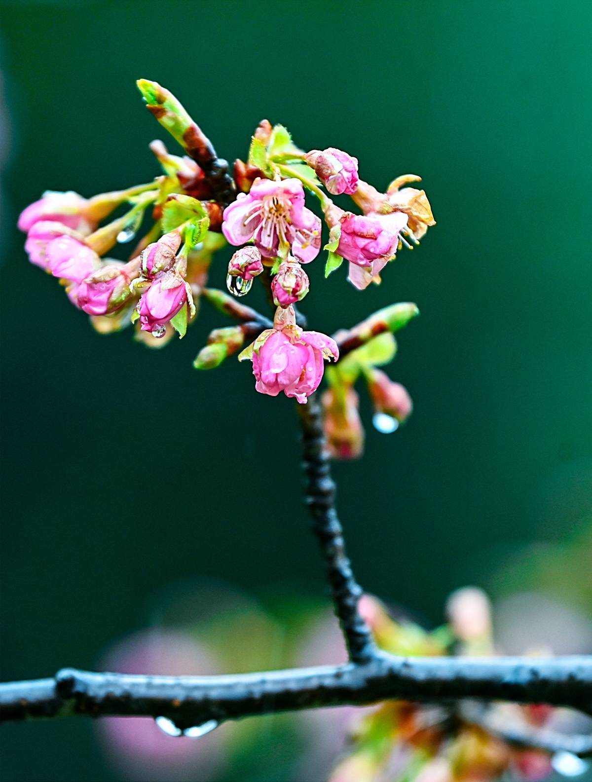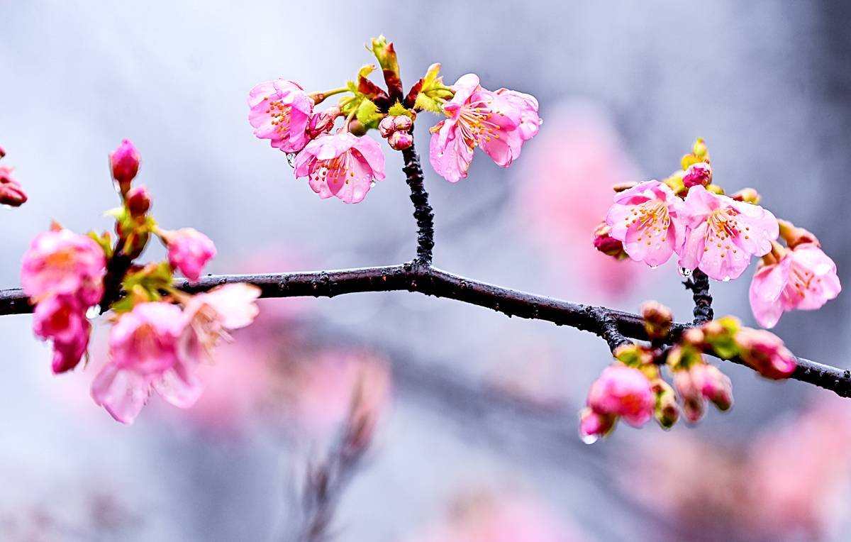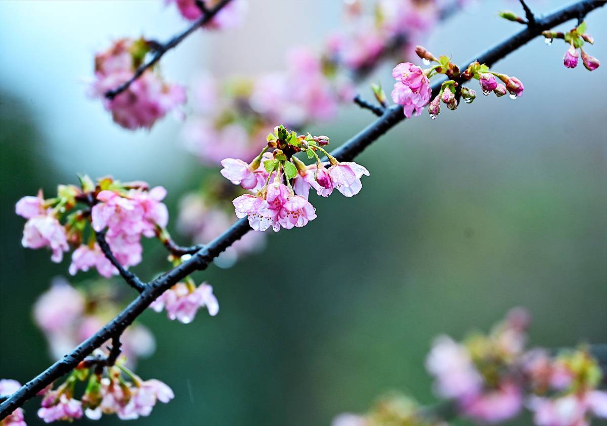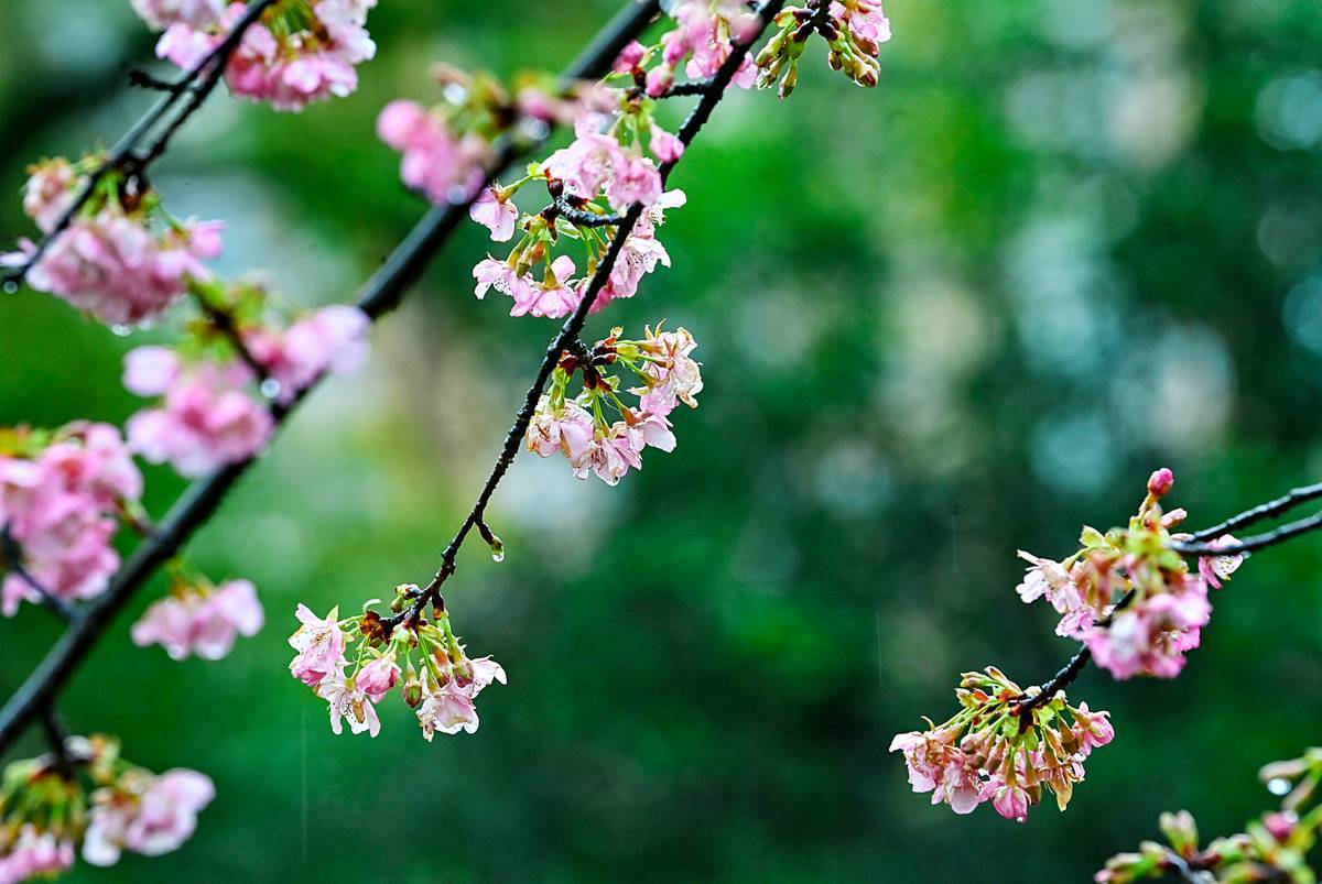 1月30日,武汉下着小雨,位于青山区的武汉市园林科普公园的早樱提前开放。