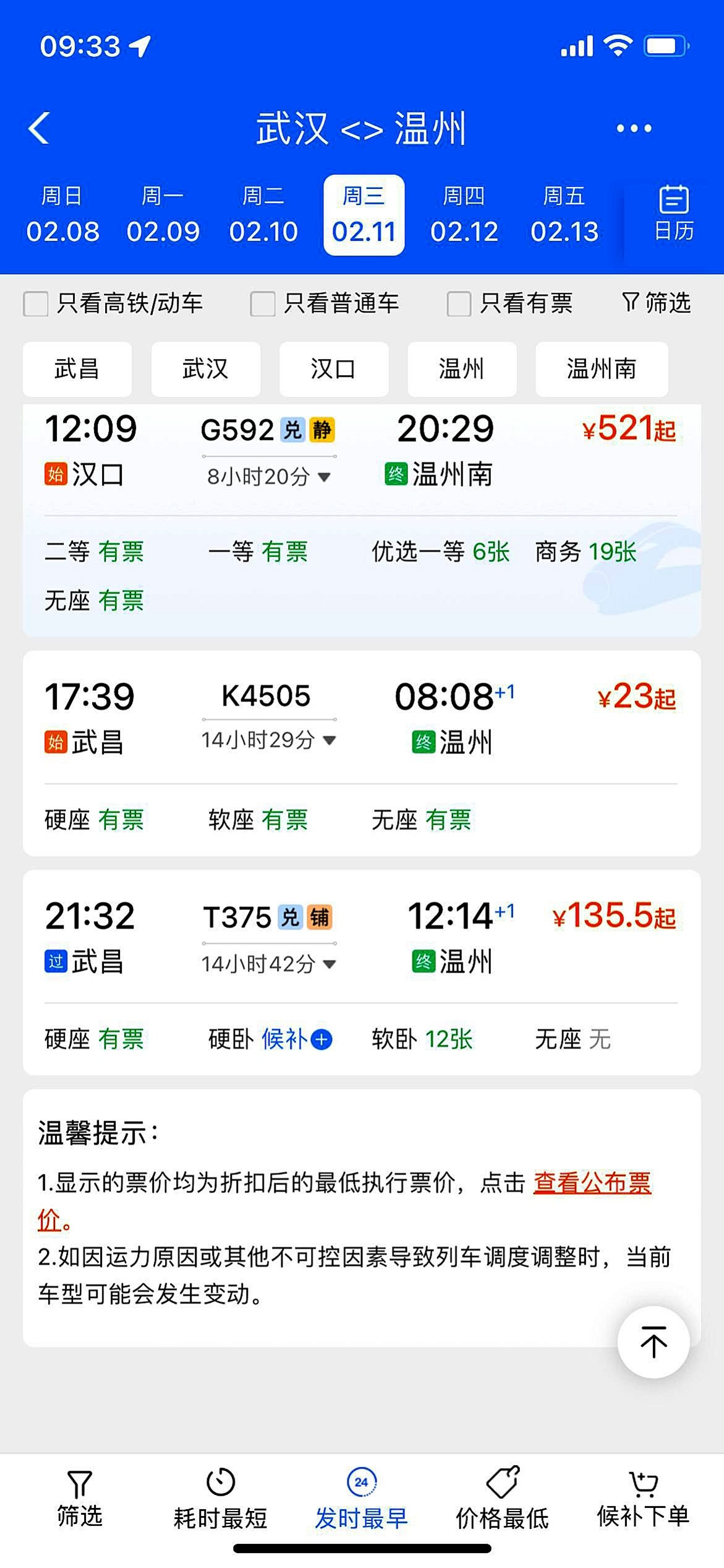 楚天都市报极目新闻讯(记者王灿)你敢相信吗?武汉到九江火车票价仅7.5元,到温州火车票价仅23元!1月29日,一位网友在12306 APP查看2月10日列车车票,发现当天从武昌站开往温州的K4505次列车,票价低得让人不敢相信。