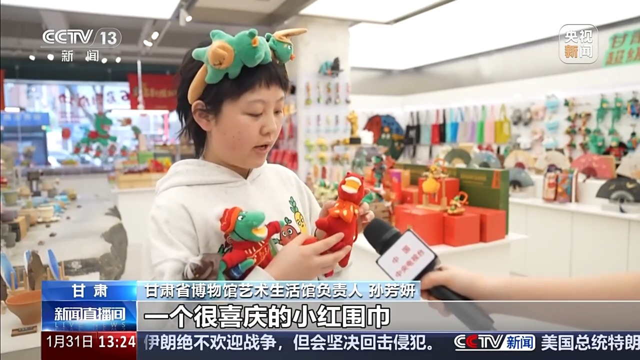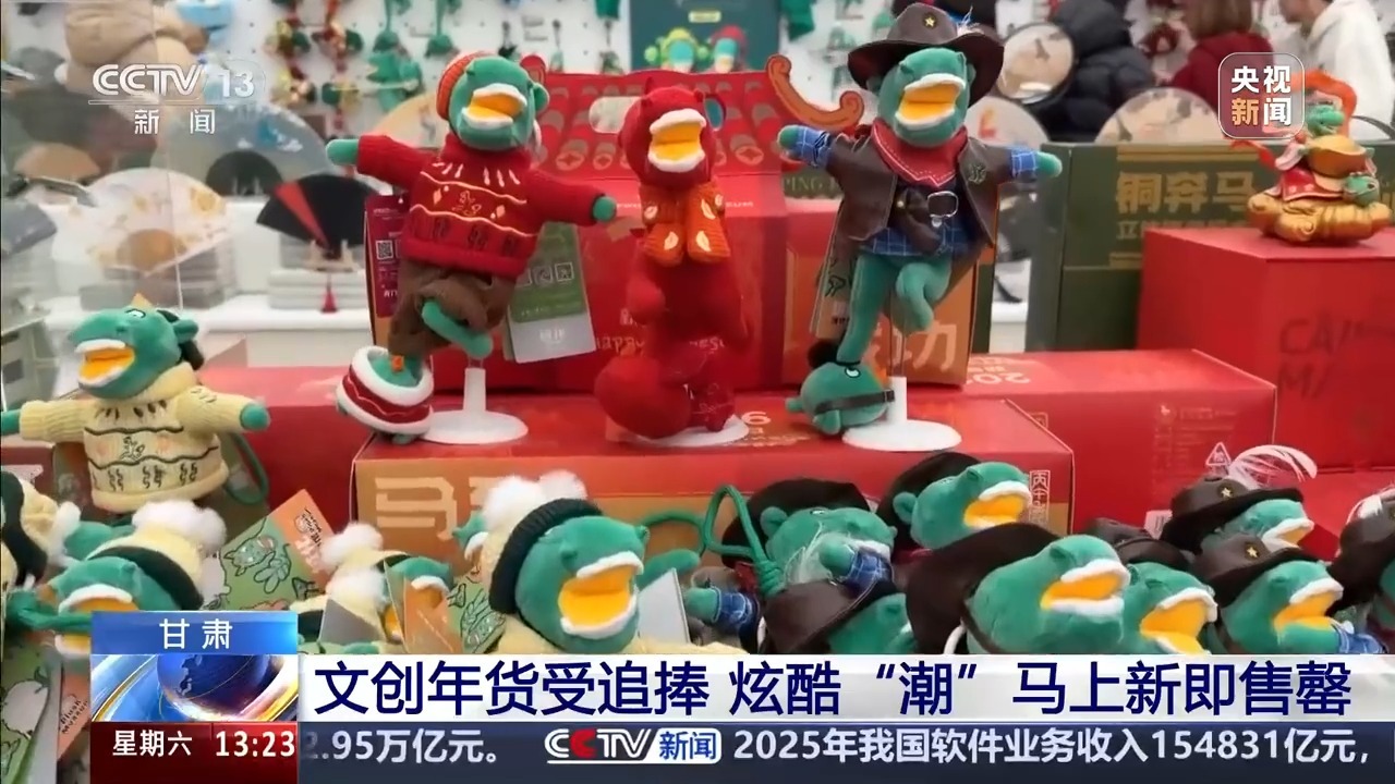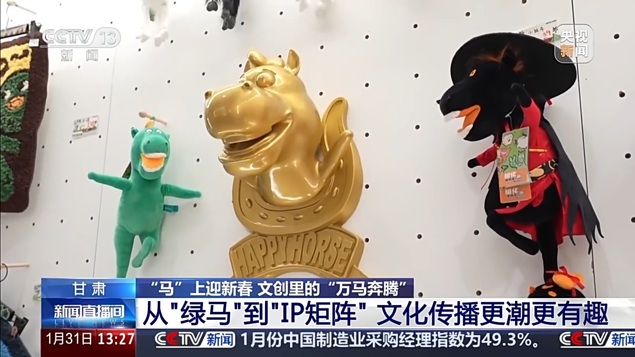 总台记者 王妍:它就是铜奔马的绒化文创——“绿马”,因“丑萌”而出圈。今年是马年,它也拥有了限定版的新春皮肤。你看,通体正红的“红运当头马”、身穿红色针织毛衣的“本命年马”,它们都是甘博今年“马力全开”系列贺岁新品。有没有哪一只戳中你的心啊?