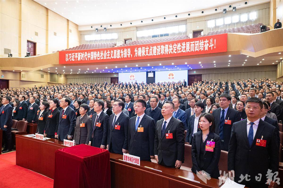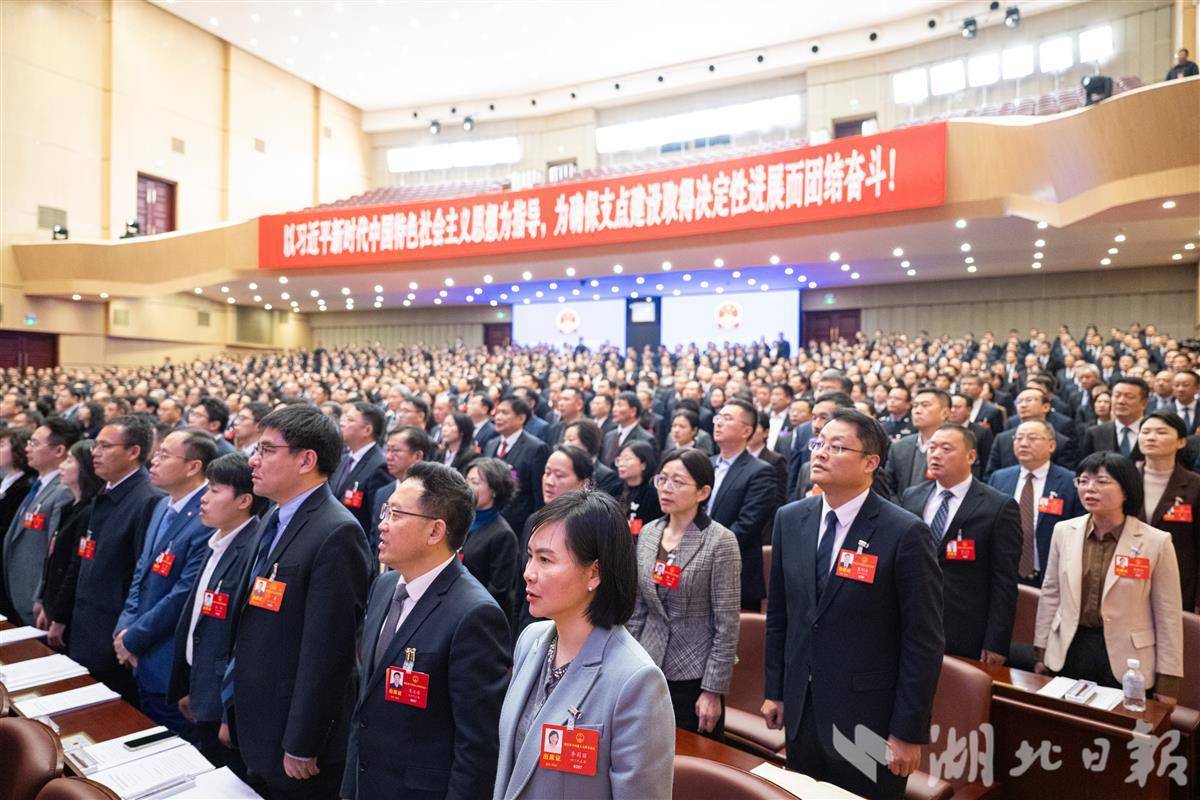 1月31日,省十四届人大四次会议闭幕会现场,全体起立唱国歌。(湖北日报全媒记者 任勇 摄)