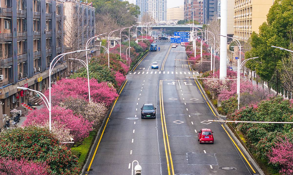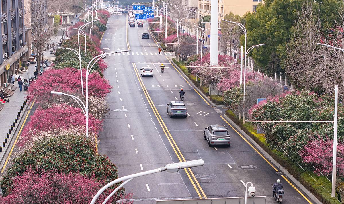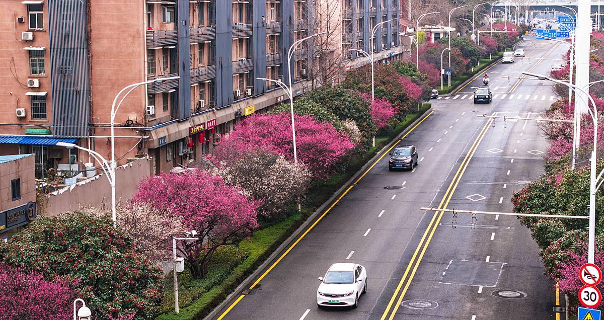 2月1日,位于武汉武昌区白鹭街两旁的梅花悄然进入盛花期。梅花是武汉市花,武昌区于2007年底开始在白鹭街沿线打造“市花一条街”,道路两侧的绿化带内间隔种植红、白、粉三种颜色的梅花。经过多年精心养护,梅树日渐茁壮,今年的梅花不但提前开并且花势分外壮观,白鹭街成为名副其实的“市花街”。(湖北日报全媒记者 朱熙勇 摄)