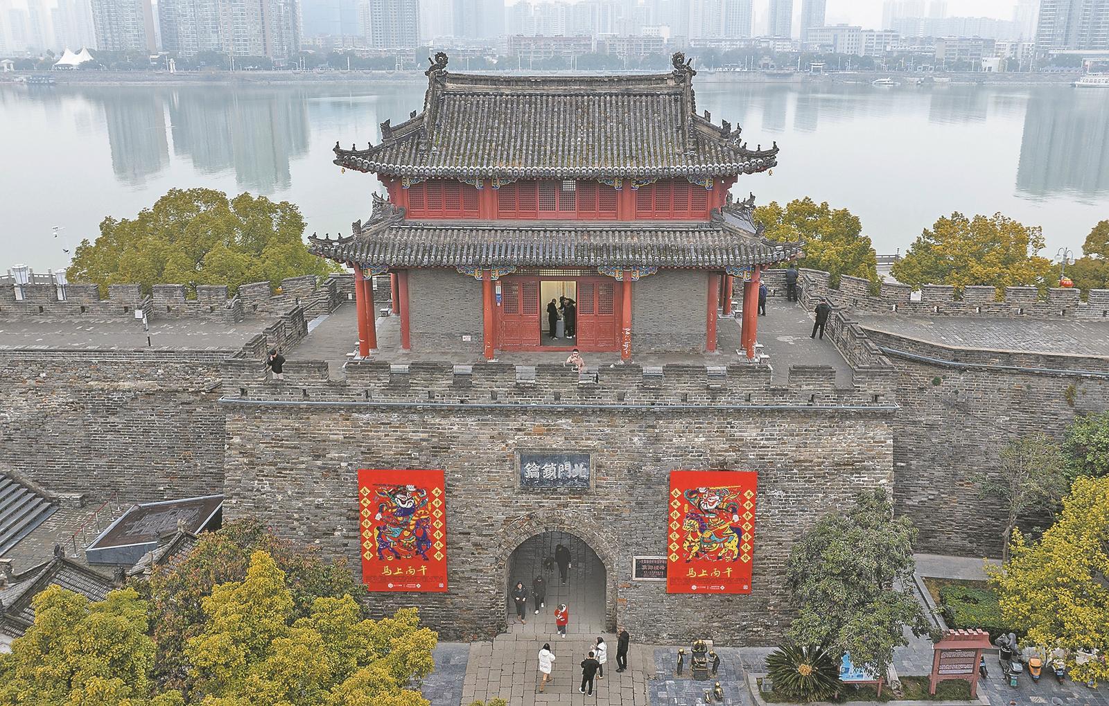 1月31日,襄阳古城临汉门、昭明台挂上了大型非遗年画。色彩鲜艳的年画吸引了不少游客驻足观赏、拍照打卡。据了解,临汉门上的年画来自国家级非物质文化遗产老河口木版年画,画的内容是传统民俗里的门神。昭明台上的年画在老河口木版年画的基础上进行创新性手绘创作,让传统门神形象在创新表达中焕发新生。