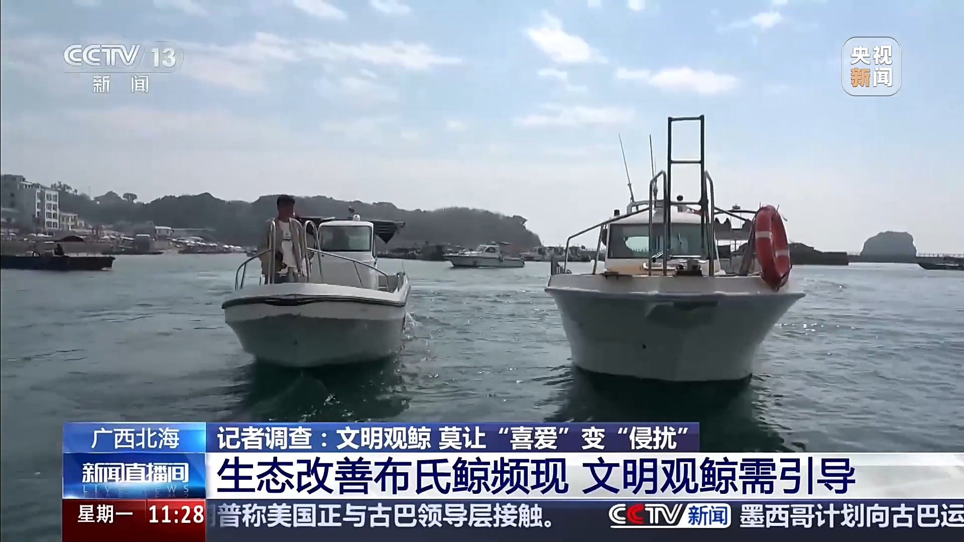 广西科学院副研究员 陈默:现在是以10人、11人的小船载客为主,岛上可能七八十条这种船,如果同时出海去观鲸的话,对于鲸的影响可能会比较多,如果从更好保护鲸的角度来说,我们觉得可以把船的船型还有载客量的这种有所更替,比如说可以载50人甚至100人的船,来取代小船,速度上可以慢一些,因为现在的船速度上有的时候也会太快了,太快对于鲸来说也容易撞到它或者是不小心剐蹭到它们。