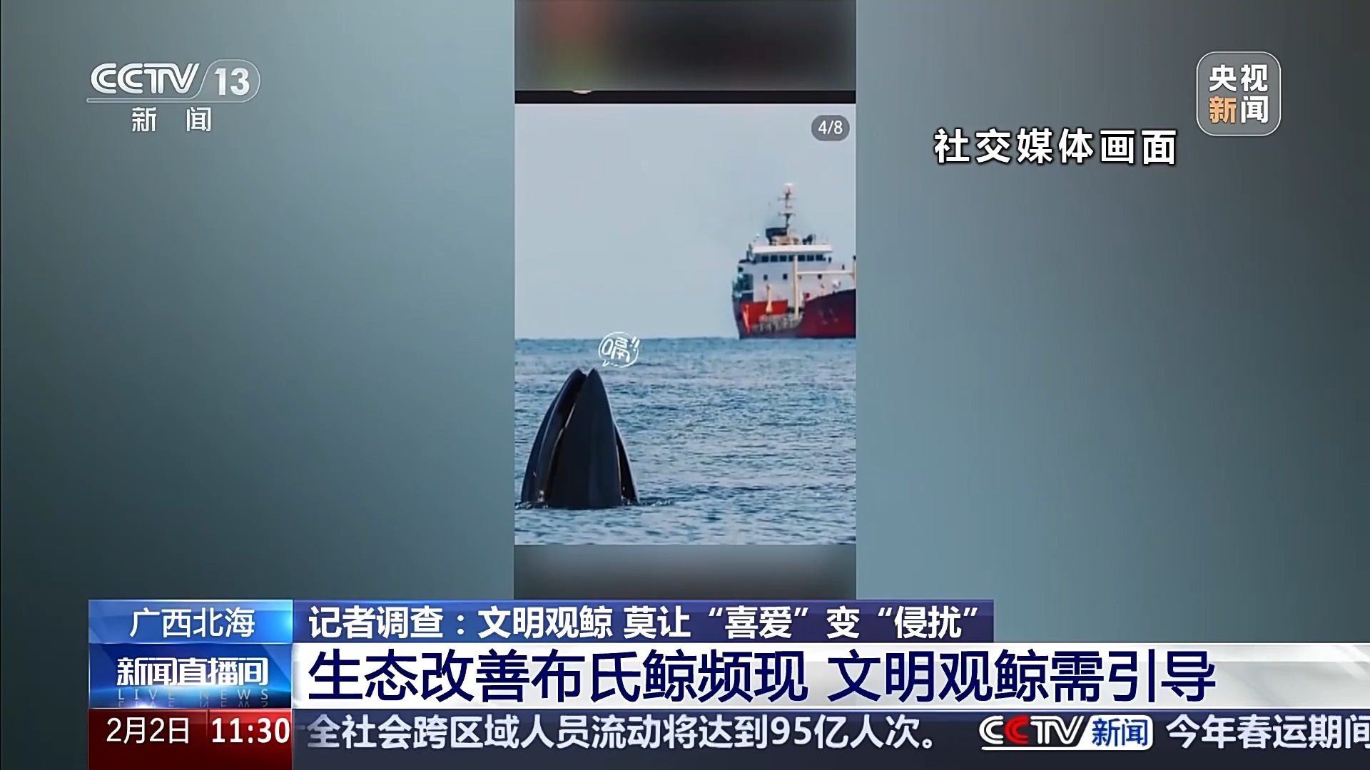 南京师范大学教授 陈炳耀:一般要求这个观鲸船离这个鲸要在100米以外。这是国际通用的标准,也是经过验证,100米之外,对鲸鱼的影响是比较小的,是可以接受的。