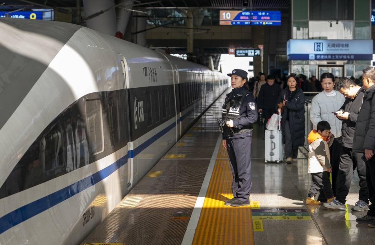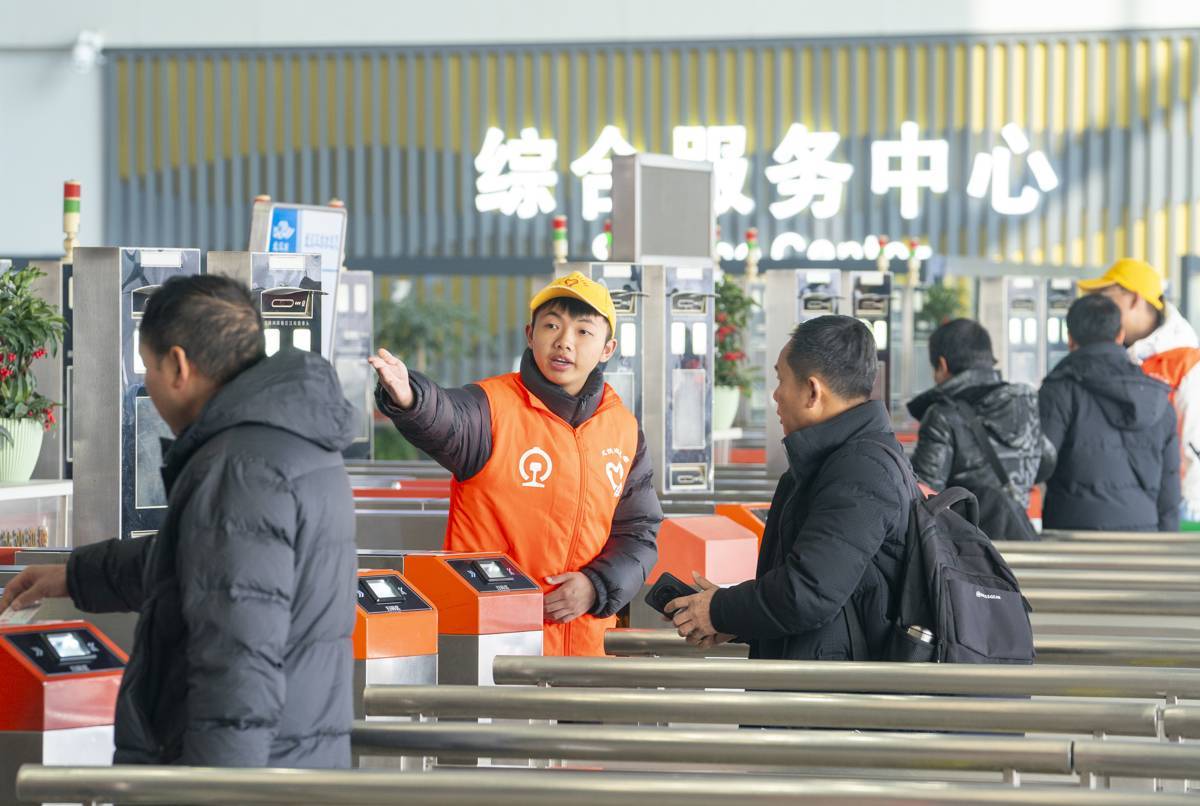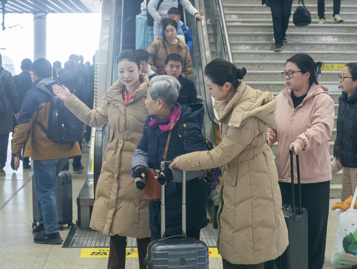 铁路民警、高铁乘务员志愿者为旅客指引乘车。