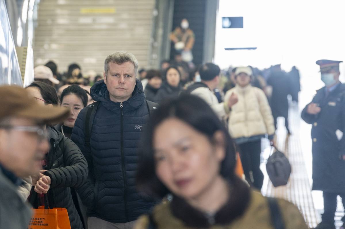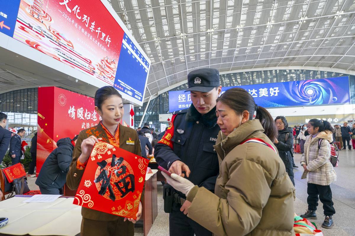 2月2日,武汉火车站,旅客们有序进站乘车。当日,为期40天的2026年春运启动。本次春运期间全国铁路发送旅客将达5.39亿人次,武汉地区节前高峰集中在2月13日(腊月廿六),节后返程高峰将出现在2月23日(正月初七)。春运期间,武汉铁路警方聚焦重点车站、重点线路、重点时段,加大巡逻防控力度,深化安检查危措施,严打盗窃、诈骗、倒票等侵害旅客权益的违法犯罪行为,持续开展隐患排查整治,动态调整安保策略,全力维护铁路运输秩序。与此同时,武汉客运段汉口城际动车组乘务车间同步升级春运服务举措,组织乘务人员开展春运服务礼仪培训,提升服务精细化水平,用耐心、细心、贴心的服务为旅客驱散旅途疲惫,为旅客打造温馨的旅途环境。(湖北日报全媒记者 魏铼 通讯员 王玉琪 周婷 摄)