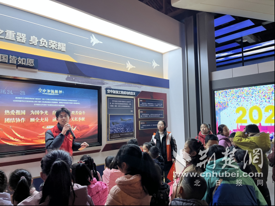 六〇九研究所相关负责人介绍:“609园区是全国唯一以‘空中加油’精神为核心的纪念与教育基地。园区以航空文化广场为核心轴线,配套建有空中加油精神教育展馆、时空记忆馆及空中吊舱研发办公旧址,通过大量实物和场景,展现了我国航空事业从‘望尘莫及’到‘望其项背’、再到‘同台竞技’的砥砺奋斗历程。”活动现场,四名退役大学生士兵志愿者结合自身服役经历与展馆展品,生动讲解军用飞机发展历程、航空英雄事迹与我国航空事业最新成就,层层引导孩子们从萌生兴趣到产生深刻的情感共鸣。曾服役于部队的志愿者唐志龙,指着战机模型为孩子们讲述试飞员为保全试验数据壮烈牺牲的英雄故事,他感慨道:“能带着孩子们重温航空发展史,讲述先辈的英雄事迹,我觉得特别有意义。尤其是听到孩子轻声说‘他真勇敢’的那一刻,更觉这份付出格外值得。”