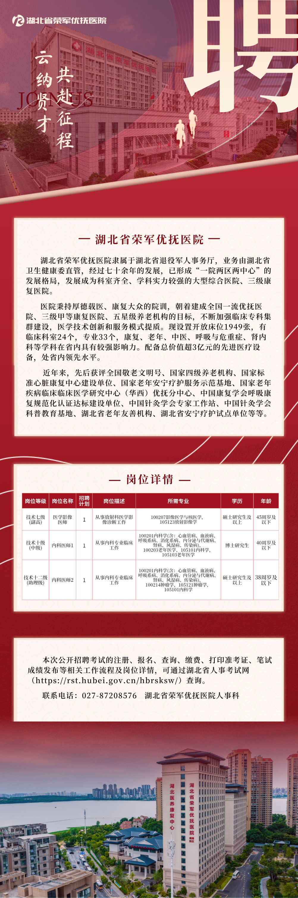 荆楚网(湖北日报网)讯(通讯员 袁鸣)近日,《湖北省省直事业单位2026年统一公开招聘工作人员公告》正式发布,省直事业单位面向社会公开招聘1327名工作人员。其中,湖北省荣军优抚医院公开招聘医学影像医师、内科医师共3人。