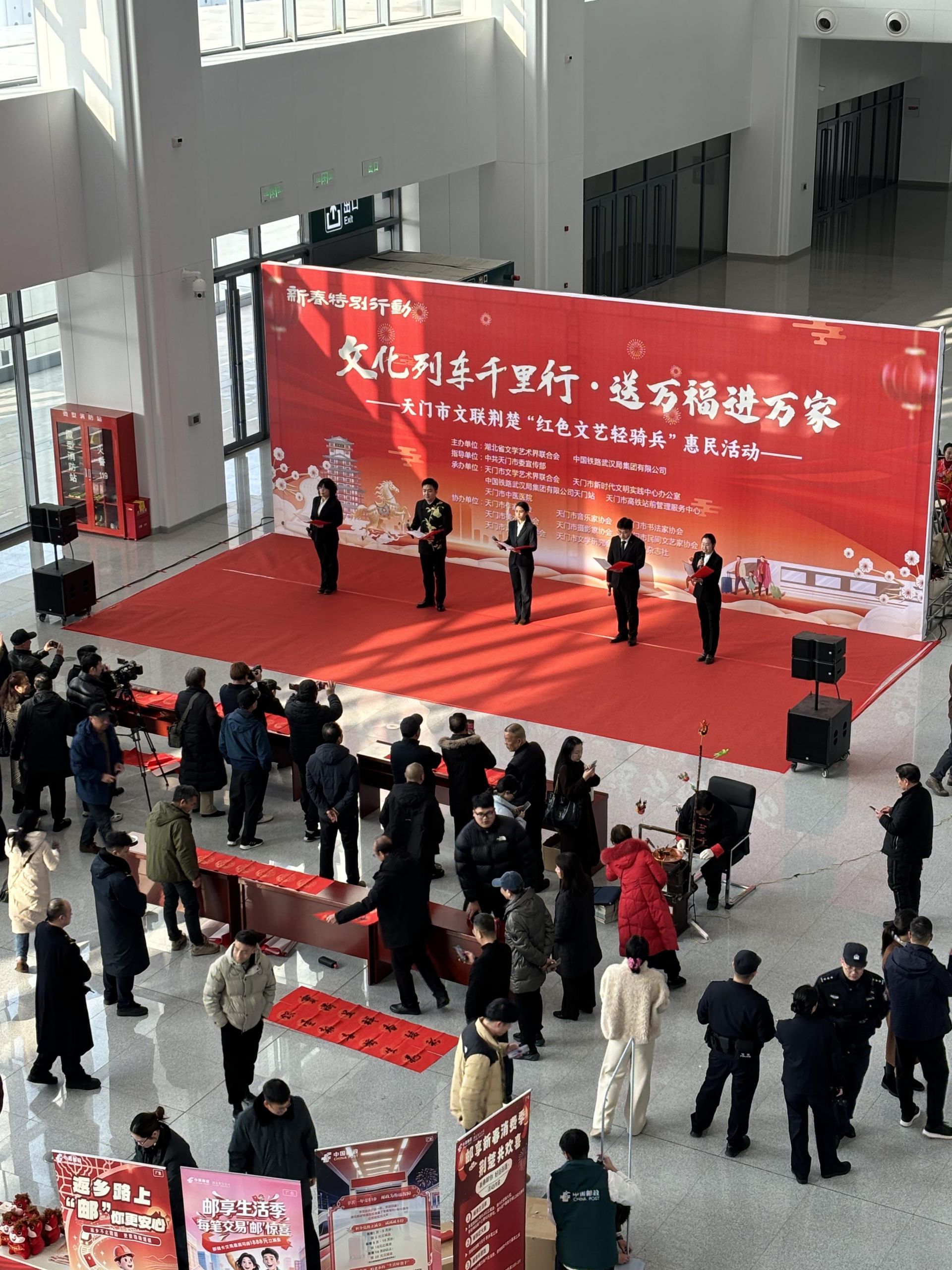 当天,以“文化列车千里行·万福进万家”为主题的天门市文联荆楚“红色文艺轻骑兵”文艺惠民活动,在天门站温馨举行。活动由天门市文学艺术界联合会、天门市新时代文明实践中心办公室、中国铁路武汉局集团有限公司天门站、天门市中医医院共同举办,十余家文艺团体(协会)参与,在春运首日为广大旅客和市民送上一场充满温情的新春文化盛宴和一系列文明实践活动。
