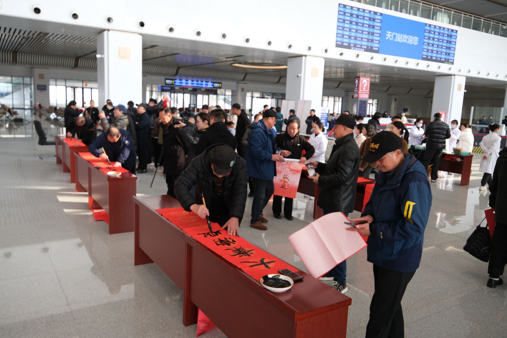 “本次活动共送出春联200余副、‘福’字100多个,发放各类刊物、手册400百份,服务旅客及市民近千人次。”天门市文联相关负责人介绍。
