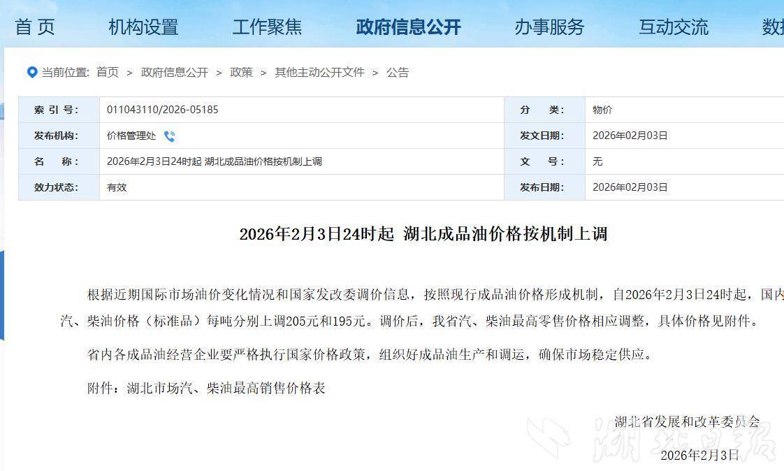 省发改委价格管理处介绍,根据近期国际市场油价变化情况和国家发改委调价信息,按照现行成品油价格形成机制,自2月3日24时起,国内汽、柴油价格(标准品)每吨分别上涨205元和195元。调价后,我省汽、柴油最高零售价格相应调整,92号、95号汽油分别涨至每升6.95元、7.44元,0号柴油涨至每升6.56元。