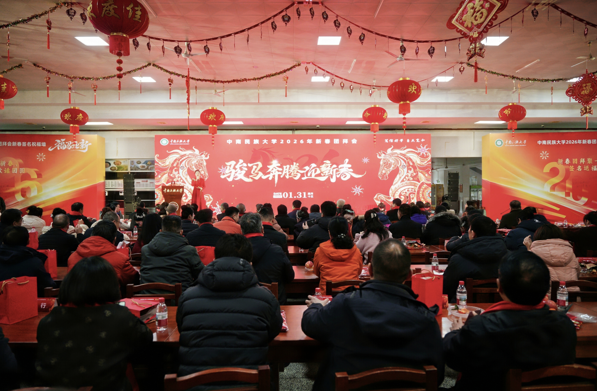 荆楚网(湖北日报网)讯(记者林杉 通讯员阮莘惠 曾权贵)1月31日,中南民族大学一食堂化为温暖的“年味客厅”,老中青三代民大人围坐一堂,在2026年新春团拜会上共话过往,同贺新年。