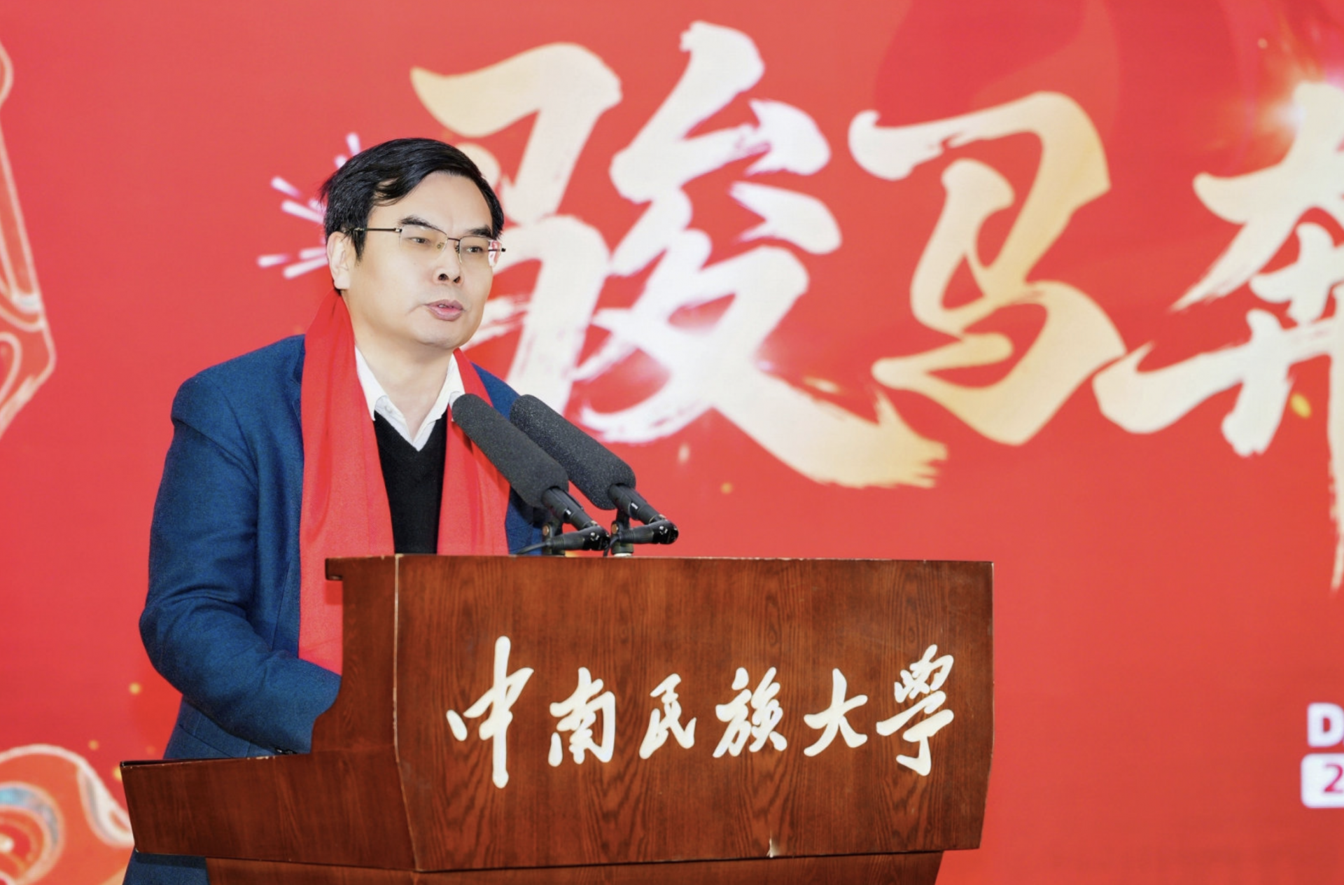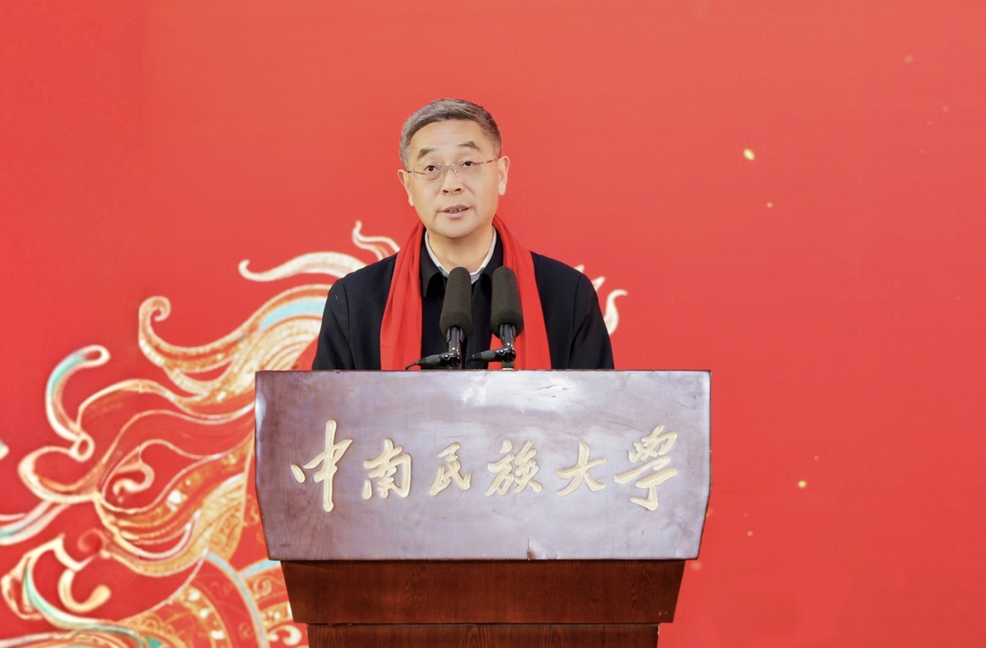 中南民族大学党委书记徐业勤发表热情洋溢的新春贺词。他代表学校党委和行政,向全校师生员工、离退休老同志、海内外校友及所有关心支持学校发展的各界朋友,致以诚挚问候和美好祝福。他表示,2026年适逢建校75周年与学校第九次党员代表大会召开,亦是“十五五”规划起步之年,学校将持续在培根铸魂上展现新担当、在转型升级上实现新作为、在提质增效上谋求新突破、在凝心聚力上激发新动能,守正创新、昂扬奋进,奋力开创特色鲜明国内一流高水平大学建设新局面。
