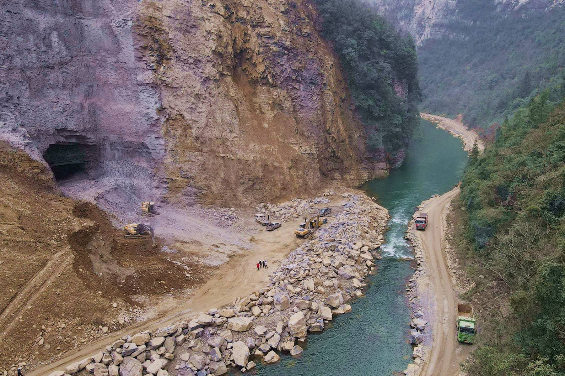1月30日,恩施市屯堡乡马者村,群山环绕中的姚家平水利枢纽工程建设现场机械轰鸣、车辆穿梭。在已贯通的2号导流洞内,工人们正手持铲子、毛刷,仔细清理底板和岩壁上的渣土碎石,随后用高压水枪进行全面冲洗。