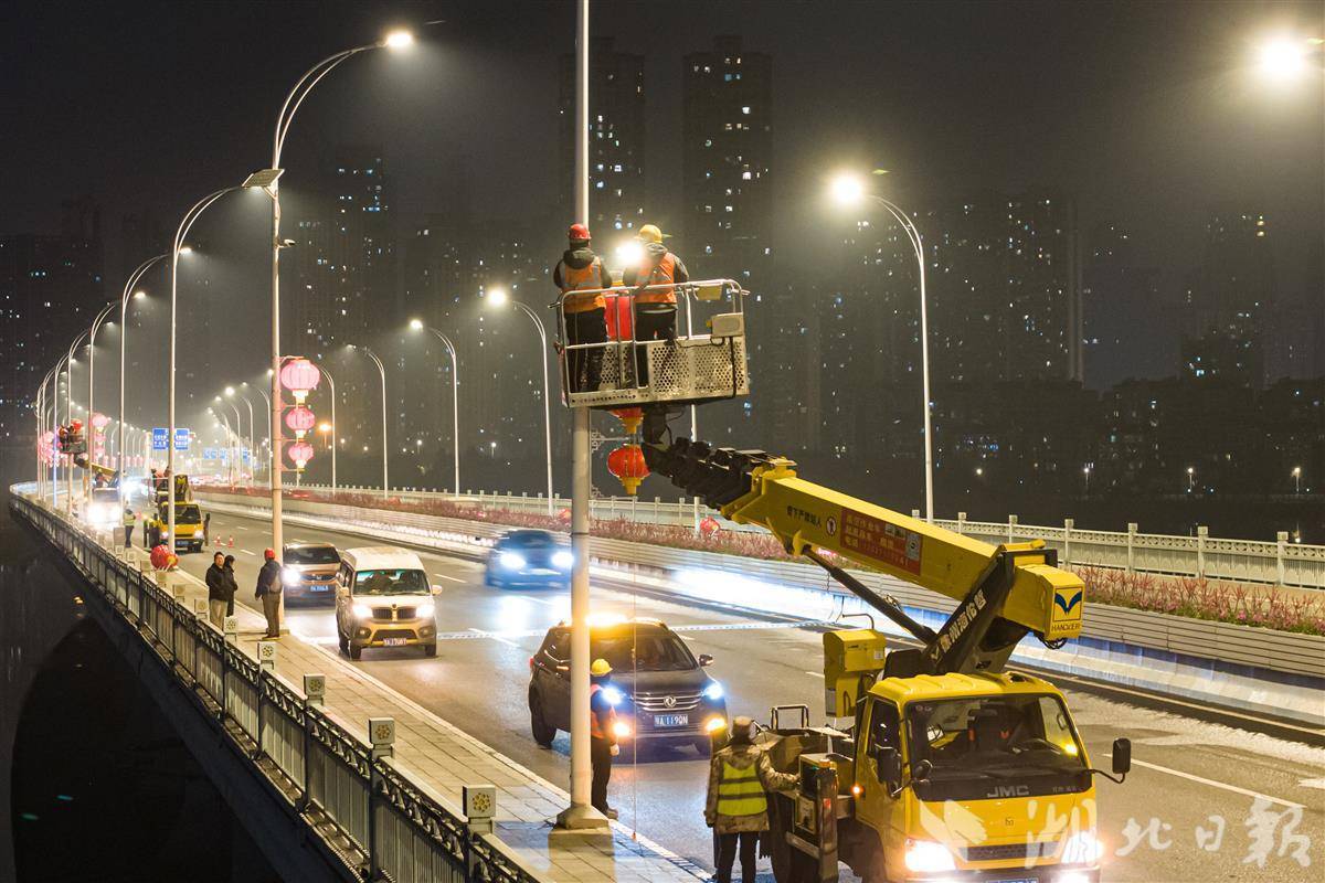 灯笼一挂,年味就来了。2月3日深夜至2月4日凌晨,武汉沙湖大桥161根灯柱上“悄悄”挂满了红灯笼。随着2026年马年春节日益临近,武汉市节日氛围营造工作正式启动。3日晚,武昌区城管组织十余名工人和数台特种车辆同时作业,在主次干道、部分桥梁高架等处统一悬挂大红灯笼等传统民俗装饰,为市民营造喜庆祥和的节日氛围。(湖北日报全媒记者 任勇 通讯员 费帆 李经纬 摄)