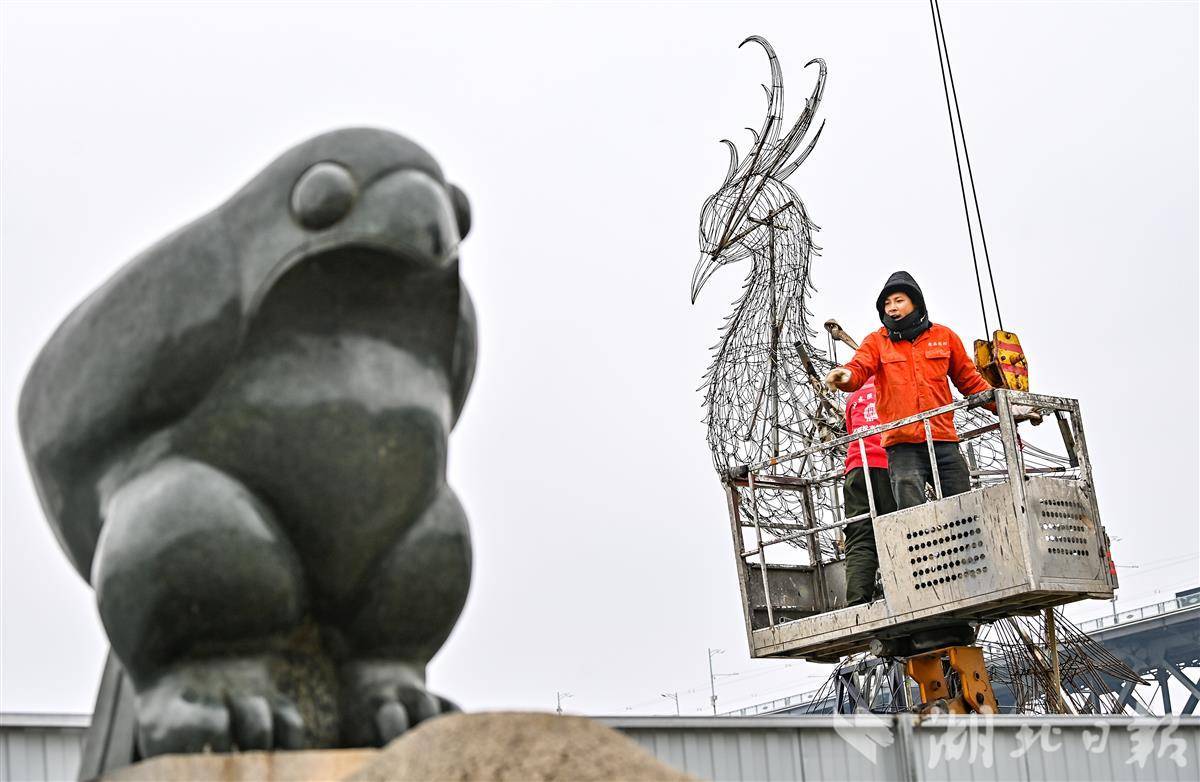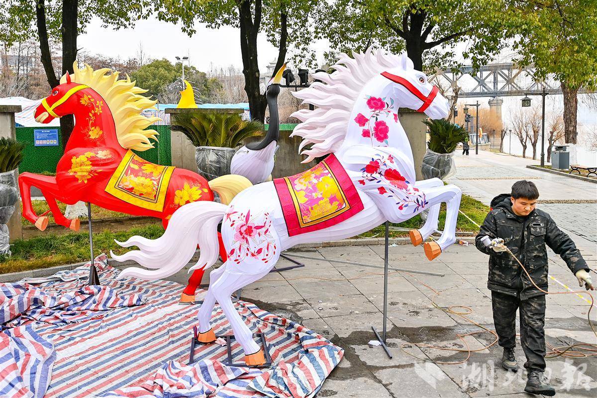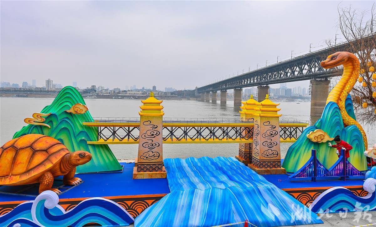 近日,在武汉长江大桥下的汉阳(朝宗门至禹王矶)江滩里,武汉文旅集团2026新春晴川灯会的施工现场一派热火朝天的景色,大部分场景已施工完善,有的甚至开始试亮灯。灯会将于2月10日开幕。