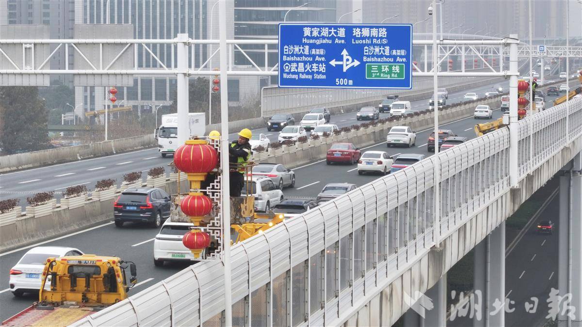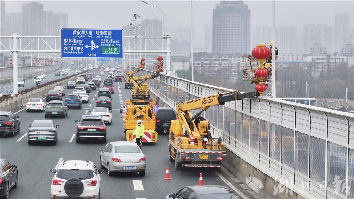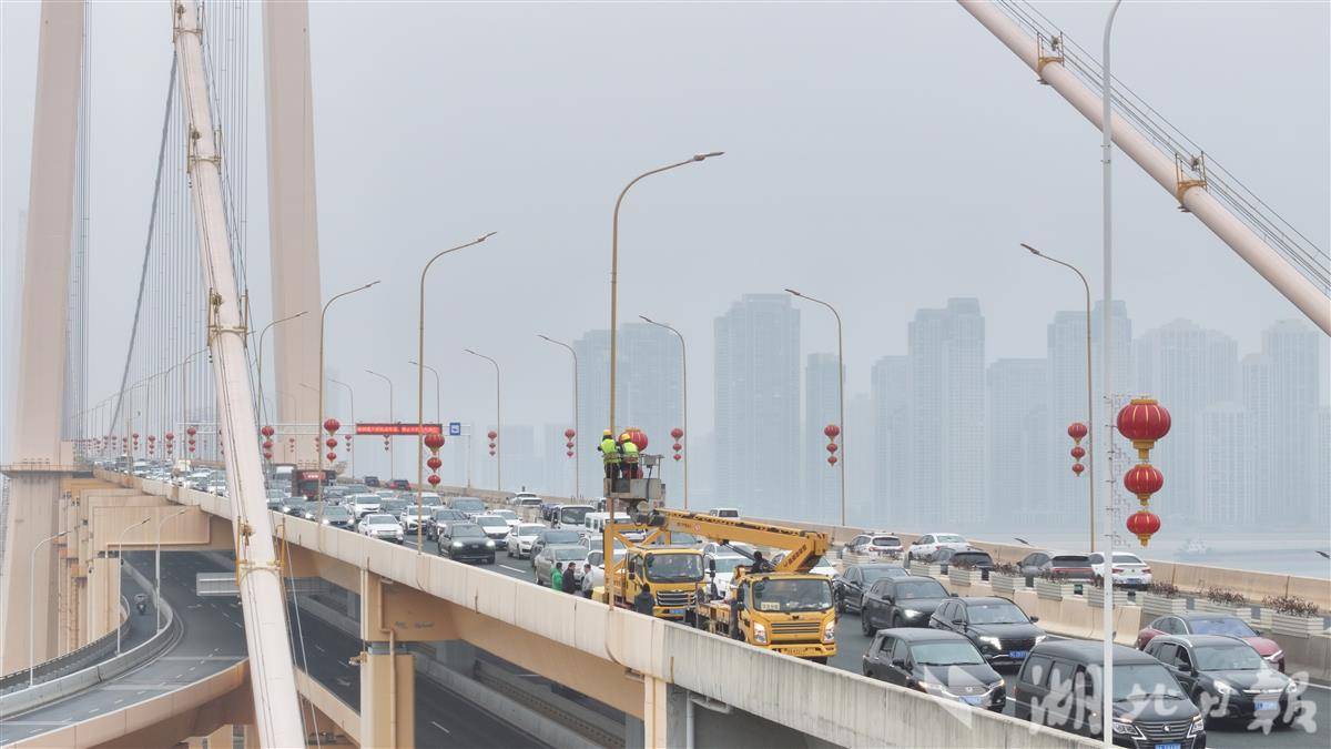 2月4日下午,洪山区城管执法局工作人员在桥体两侧悬挂灯笼。