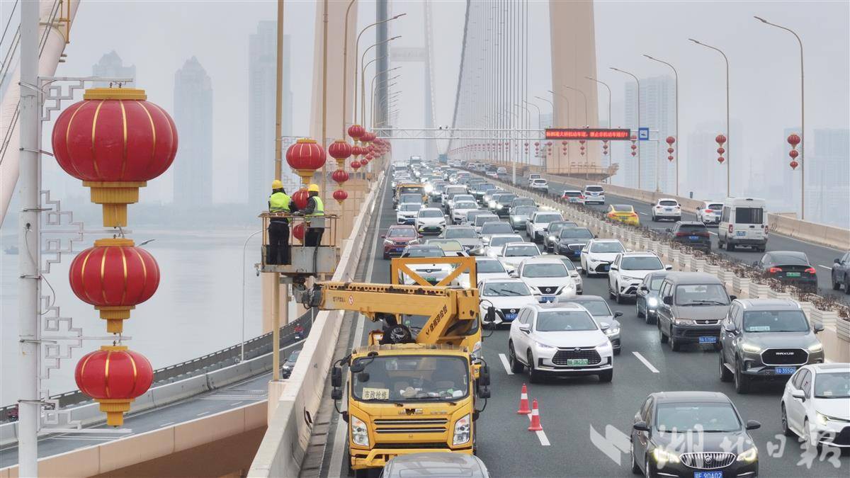 杨泗港长江大桥挂上新春“中国红”。