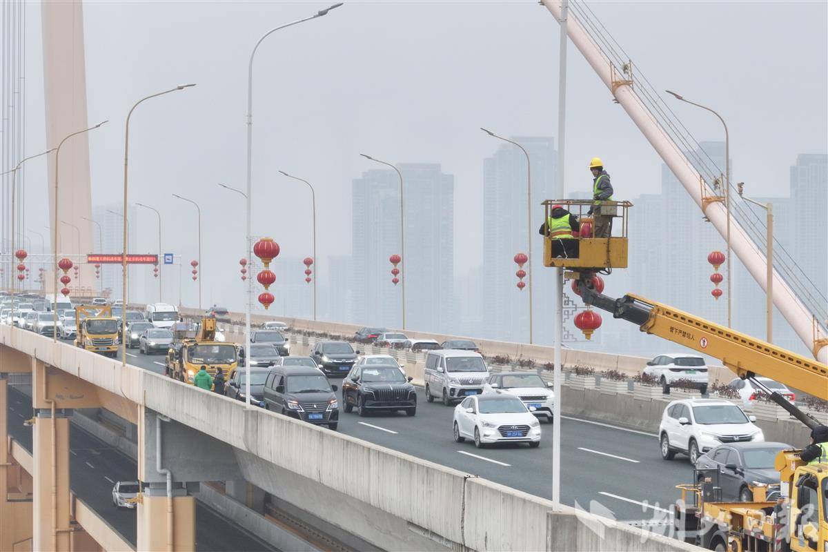 2月4日下午,细雨中的武汉杨泗港长江大桥迎来一片火红。洪山区城管执法局工作人员正冒雨在桥体两侧悬挂灯笼,为新春佳节增添喜庆氛围。