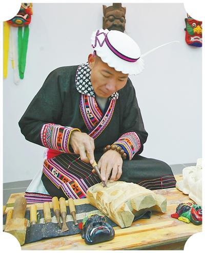 田虎塔在制作曹盖面具。图为本报记者宋豪新摄