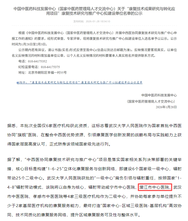 近日,中国中医药科技发展中心(国家中医药管理局人才交流中心)正式公布“康复技术成果研究与转化应用项目”康复技术研究与推广中心拟建设单位名单。经过全国范围的遴选以及多轮严格评审,武汉大学人民医院(湖北省人民医院)成为湖北省唯一的国家级中心牵头单位,而潜江市中心医院康复医学科成功获批二级康复技术研究与推广中心。作为全省仅有的4家二级中心之一,此次获批标志着潜江康复医学正式接入国家级技术推广网络,家门口的康复服务迈入“国标时代”。
