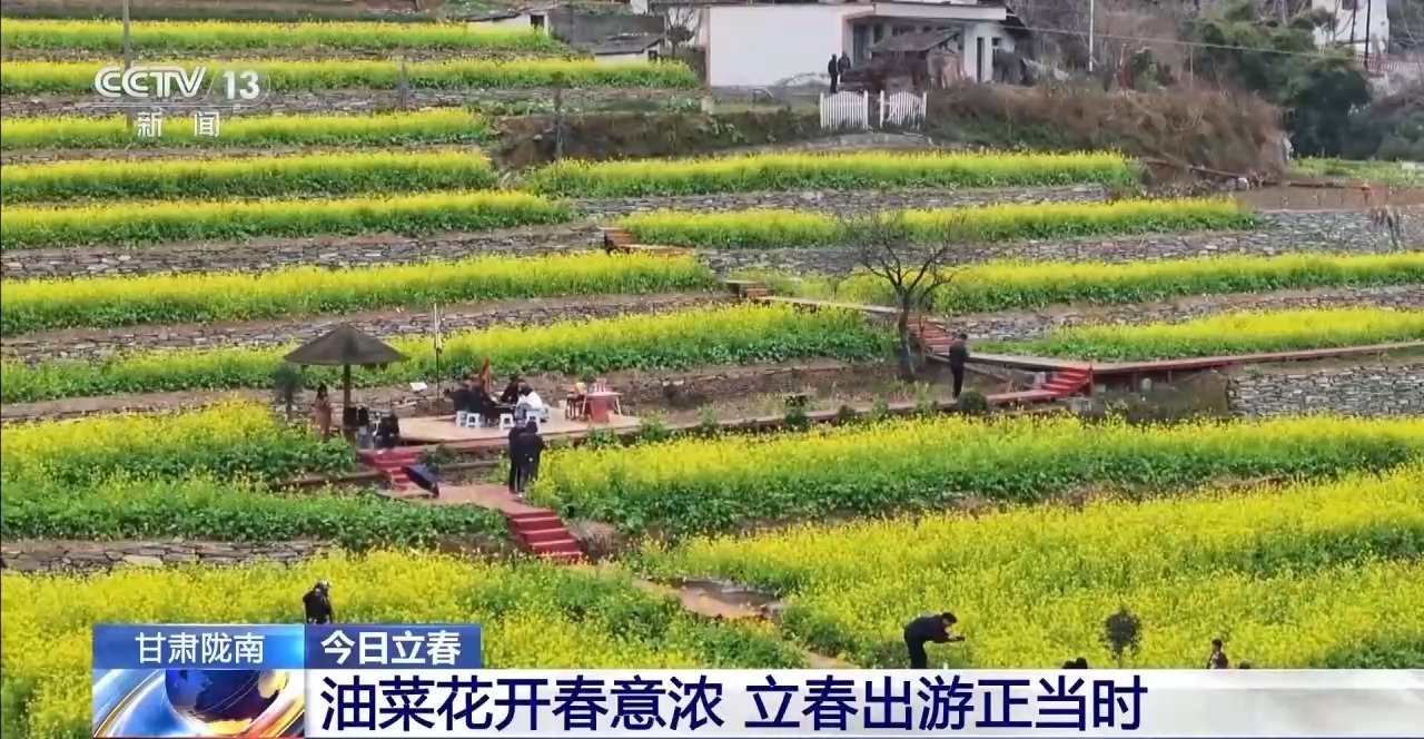 在陇南市文县玉垒坪村,鹅黄的花海与碧水、村庄相互映衬。盛放的油菜花吸引了省内外游客前来踏青,赏花、拍照、游村庄,这里成为大家立春出游的热门选择。