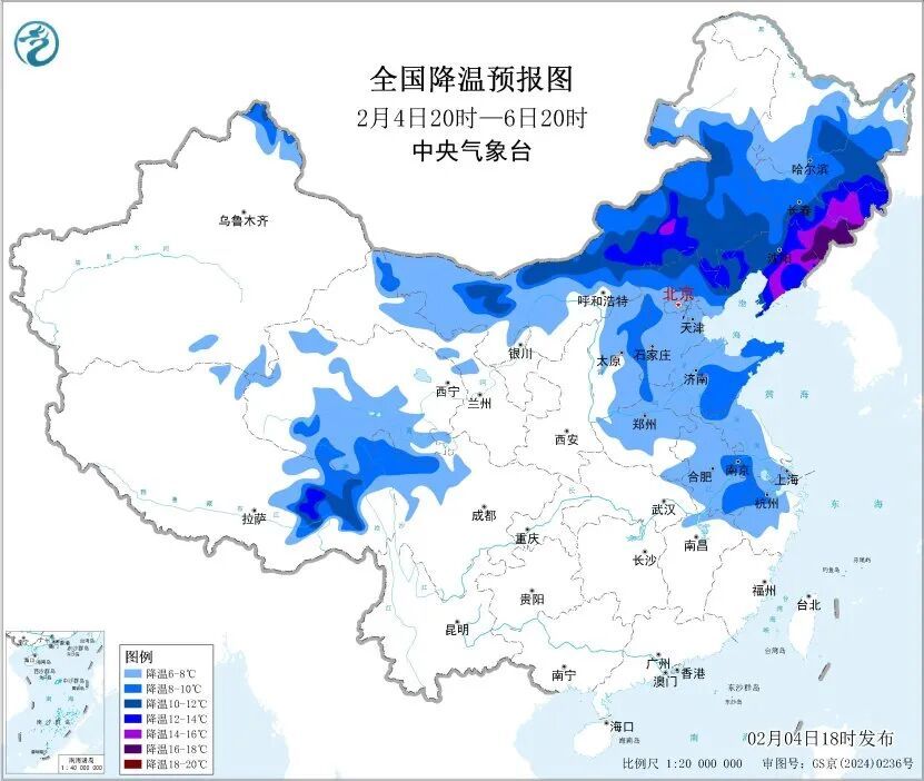 预计,2月4日20时至6日20时,内蒙古大部、东北地区大部、华北、黄淮、江淮、西藏东部等地将先后降温6℃至10℃,其中,内蒙古中部、东北地区东部等地部分地区降温可达12℃至16℃。