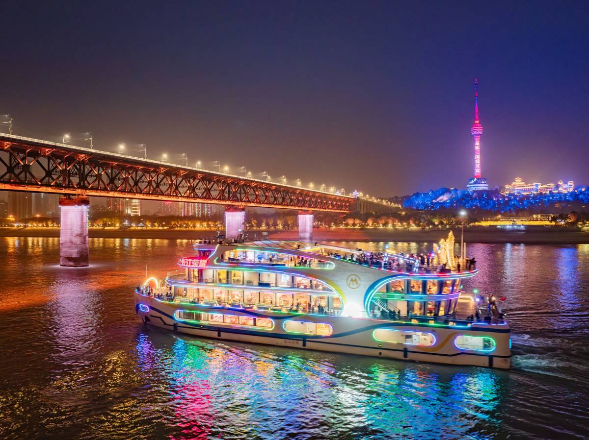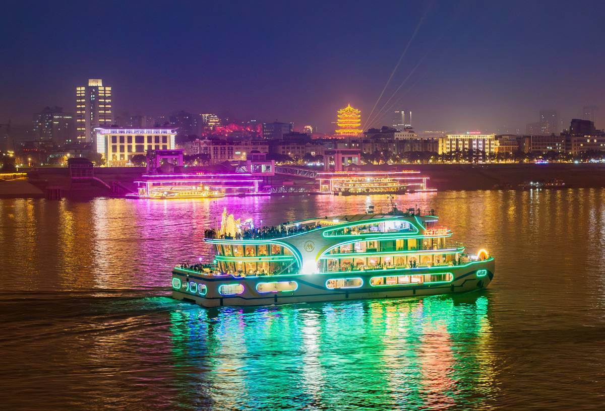 2月4日晚,武汉夜游标杆游船“长江荣耀”轮焕新回归长江夜景画卷。