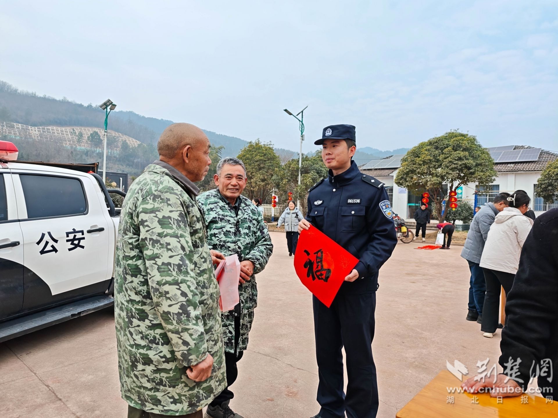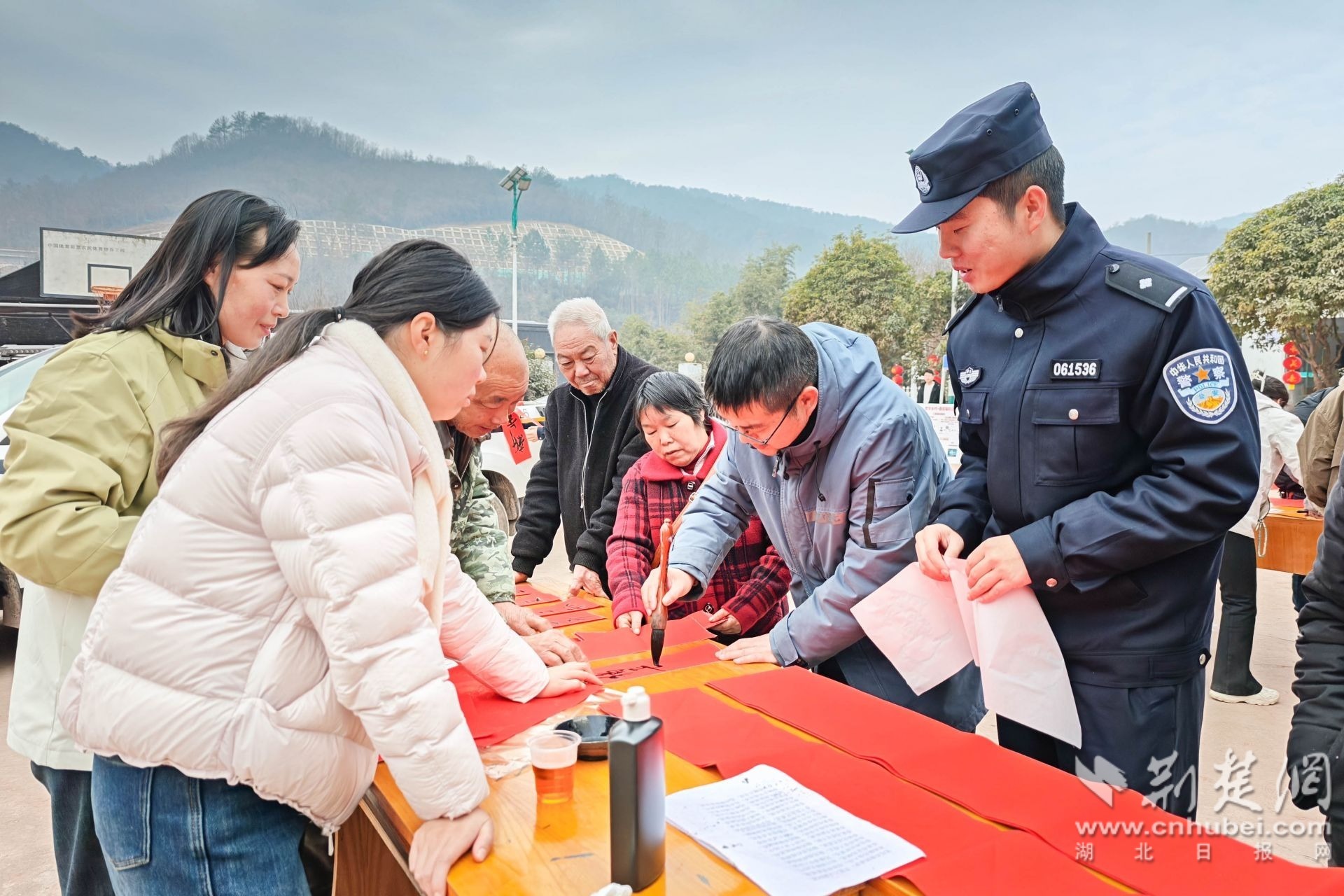 活动现场最为热闹的角落,围着一群村民,茅坪派出所的民警王锷正帮忙压着红纸。书法老师挥毫泼墨,“网络诈骗花样多,不听不信不转账”,一副笔力遒劲的行书对联在他笔下流淌而出,引来一片赞叹。“这春联有意思,贴在门上天天能看到,能提醒人!”村民古大爷拿着墨迹未干的对联,笑得合不拢嘴。
