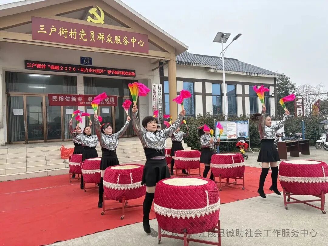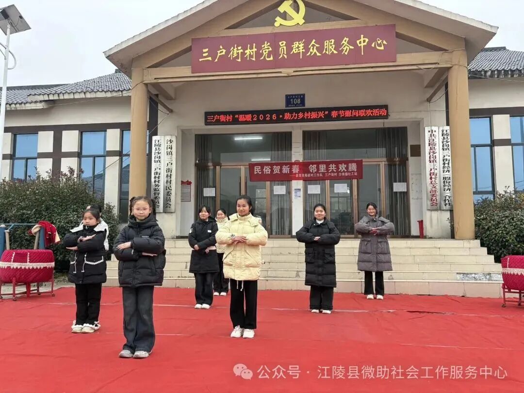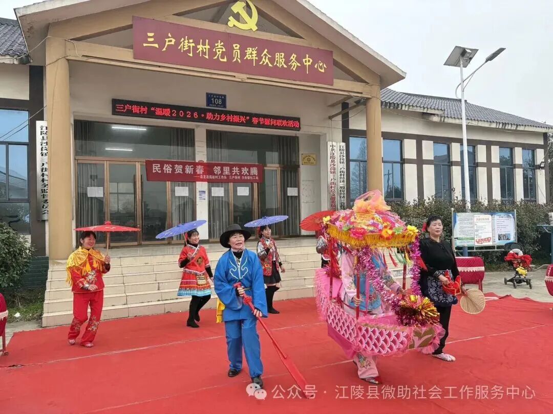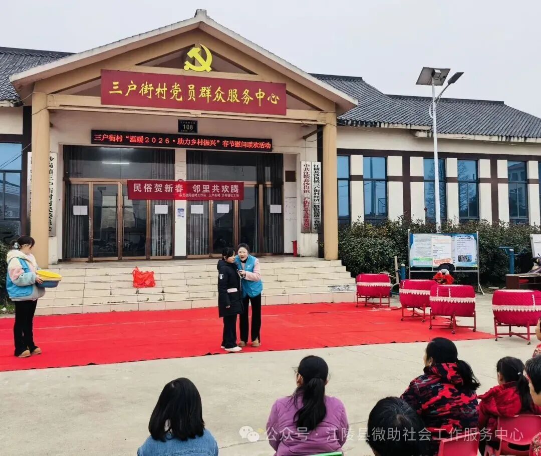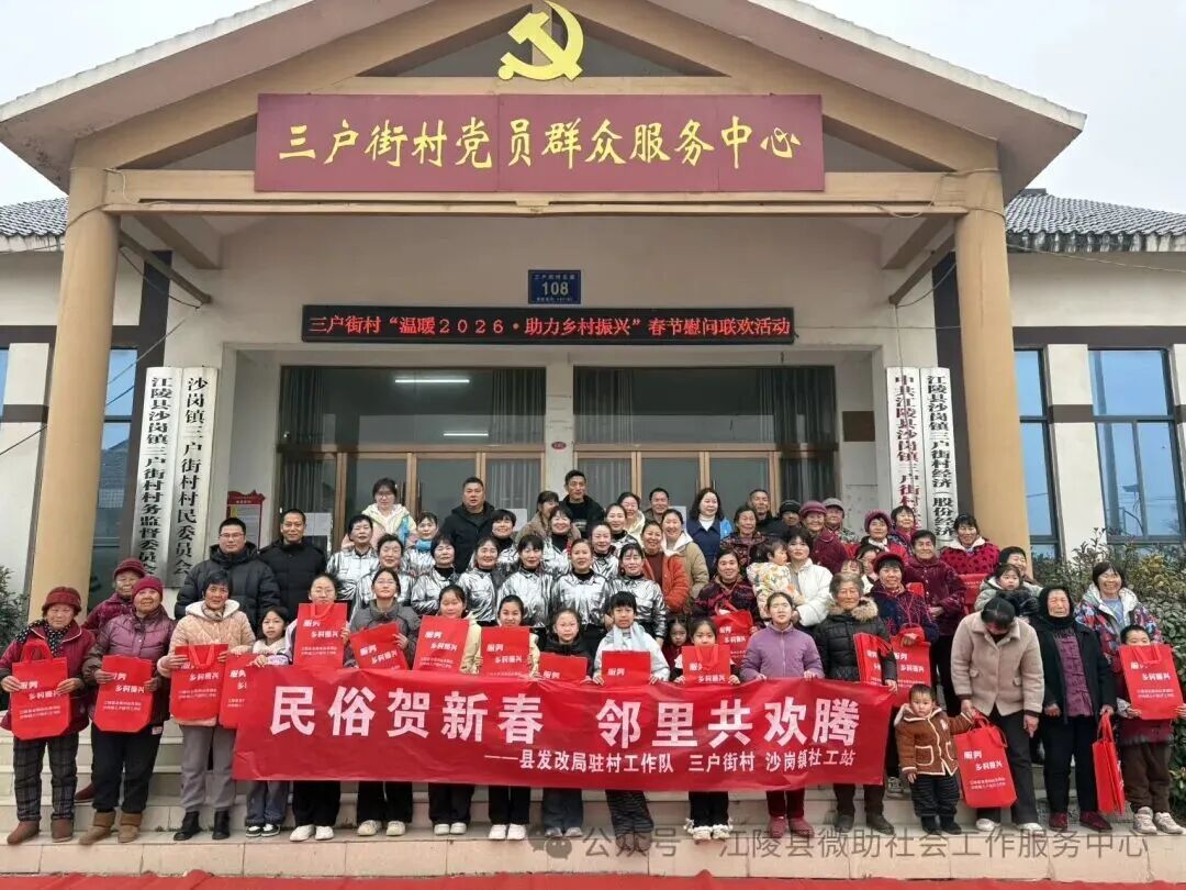 2月4日立春当天,沙岗镇三户街村村委会广场热闹非凡,一场“民俗贺新春 邻里共欢腾”为主题联欢会在此举行。此次活动由江陵县委社会工作部、沙岗镇、县发改局等部门指导,微助社工驻沙岗镇社工站联合三户街村党支部共同举办。村支书杨传俊与县发改局驻村组长尹官海登台致辞,为村民送上新春祝福。
