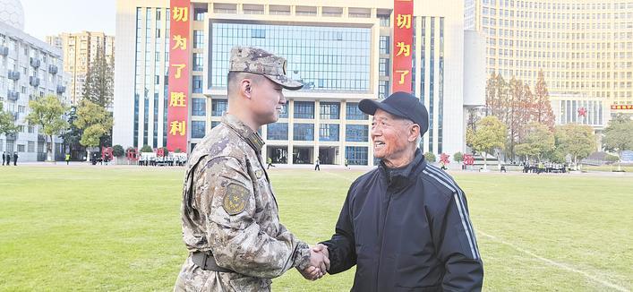2025年11月29日,詹玉华(右)与龚嘉骏在空军预警学院握手。 (湖北日报全媒记者 王际凯 摄)