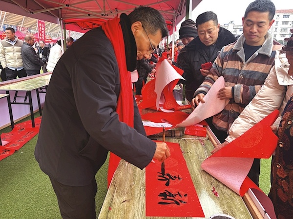 非遗展示与民俗体验区人来人往、热闹非凡。书法爱好者现场挥毫泼墨,为市民免费书写春联、送“福”字;古法打糍粑体验区吸引了不少家庭参与,孩子们在家长带领下捶打糯米,体验传统年俗乐趣。
