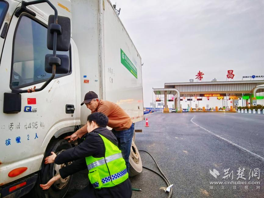 当日下午,孝昌收费站外勤人员巡查时发现,一辆白色冷链货车停靠在收费广场外,司机正围着爆胎的车轮焦急不已。询问得知,车辆行驶至孝昌段时突发爆胎,而李师傅独自驾车,既无维修工具也缺乏换胎经验,一时束手无策。