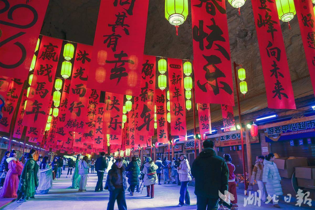 2月5日,利川市腾龙洞景区,游客在观灯游玩。当天,以“腾龙映灯彩 骏马踏春归”为主题的腾龙洞新春灯会彩排,吸引不少游客先睹为快。据悉,腾龙洞景区新春灯会将土家族文化,与自贡传统彩灯相结合,展现出多元的艺术氛围,是2026年全国“我们的节日 春节”系列活动的特色灯会,将于2月10日正式浪漫亮相。(视界网 张光陆 摄)