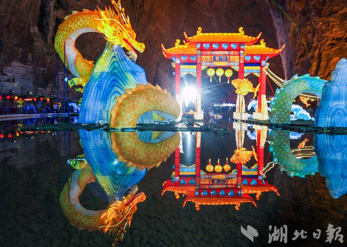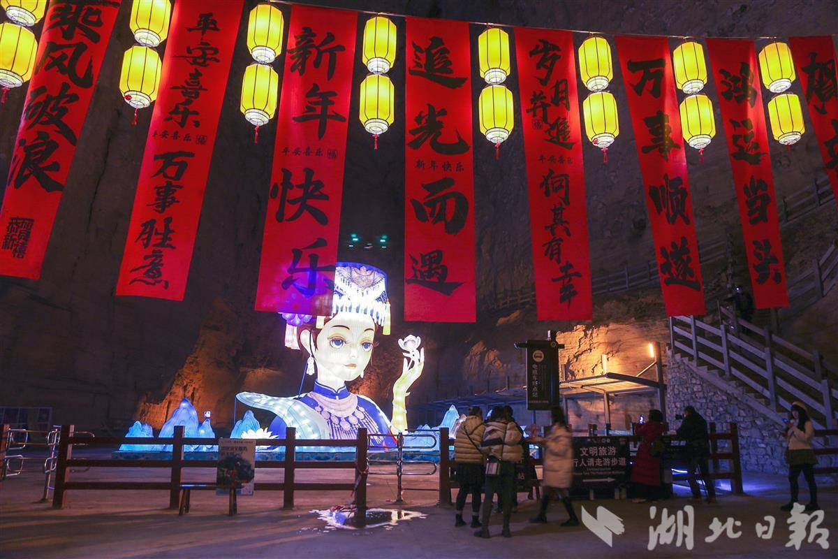 2月5日,利川市腾龙洞景区,游客在观灯游玩。