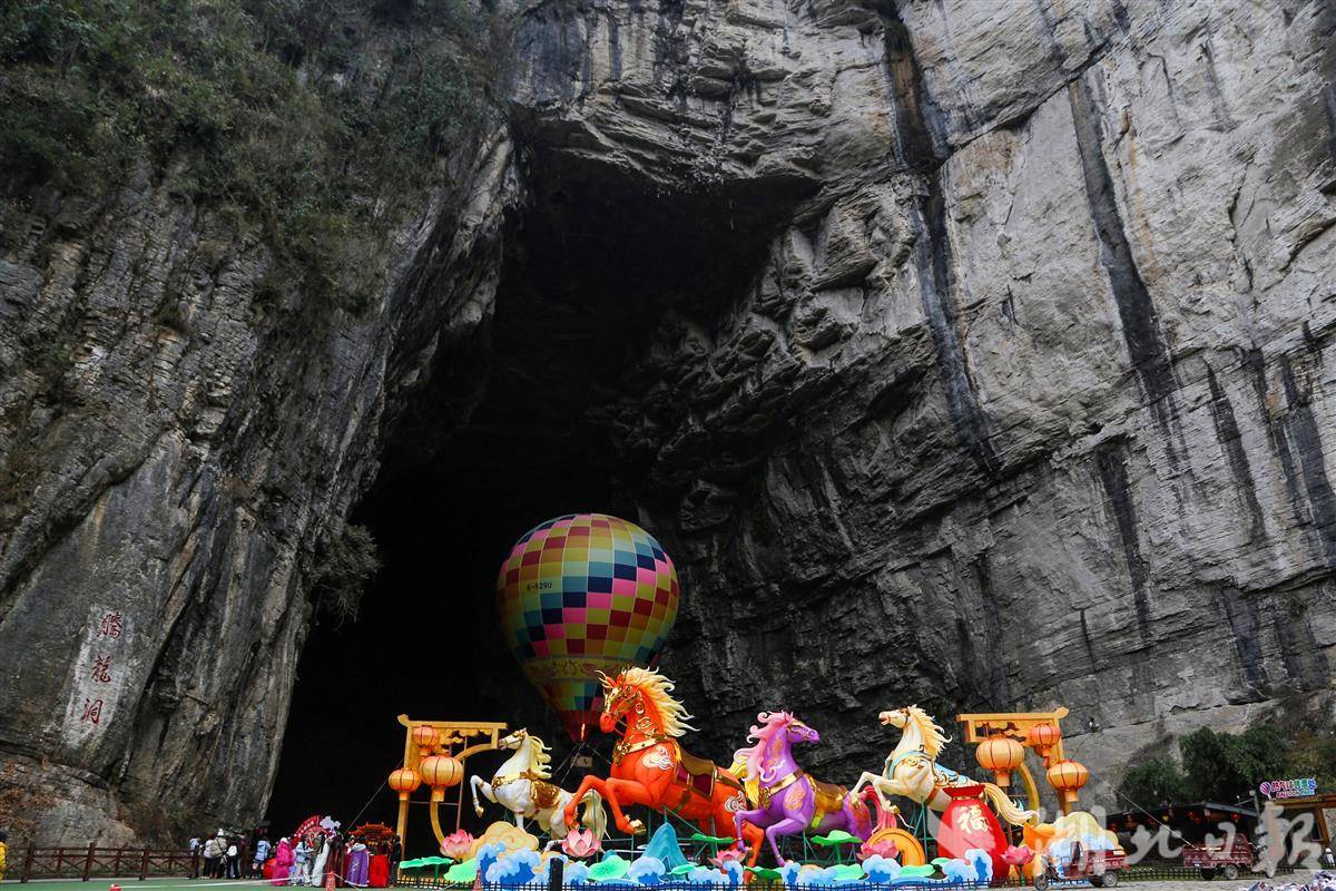 2月5日,利川市腾龙洞景区,安装完毕的骏马踏春灯组。