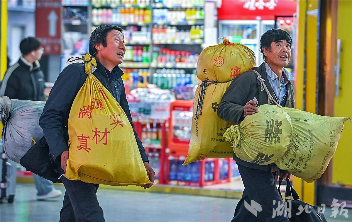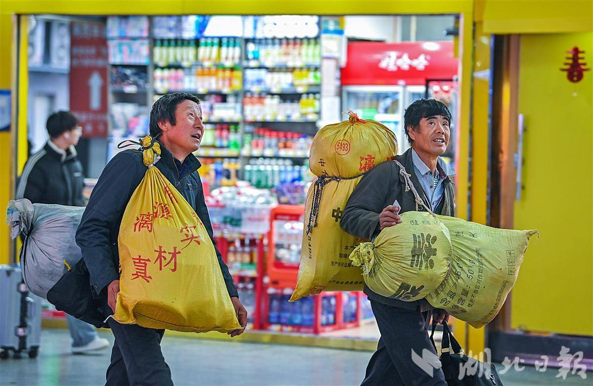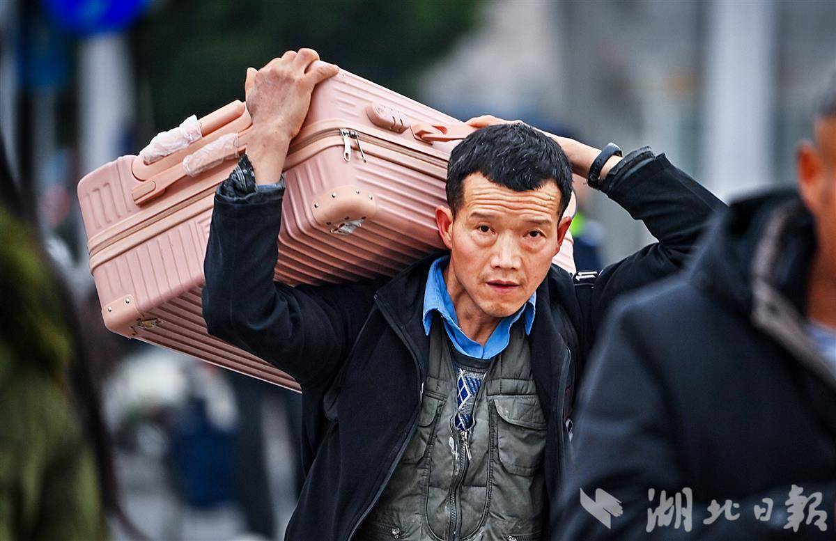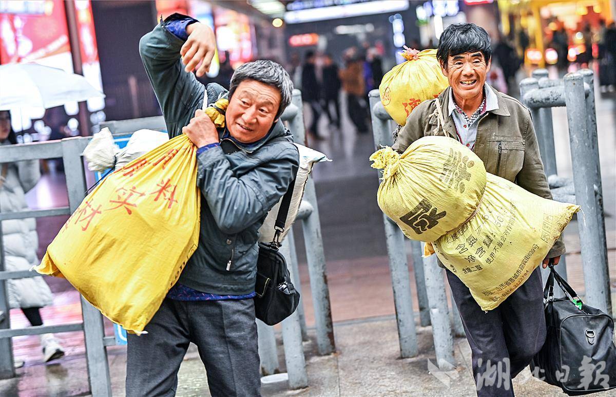 2月6日上午,武汉一直下着雨,记者在武昌火车站看到,行色匆匆的人流中,处处可见或背或拎着大包小包,正赶回魂牵梦萦的家。身上的行囊里,尽是归家之人的思念与期待。(湖北日报全媒 记者 朱熙勇 摄)
